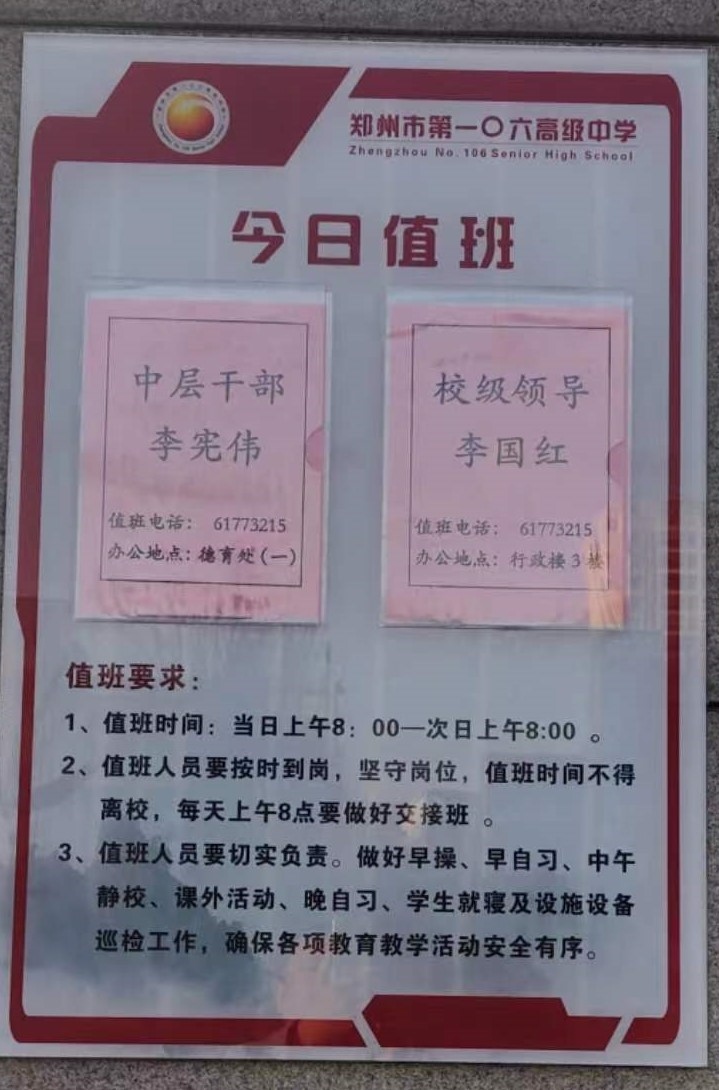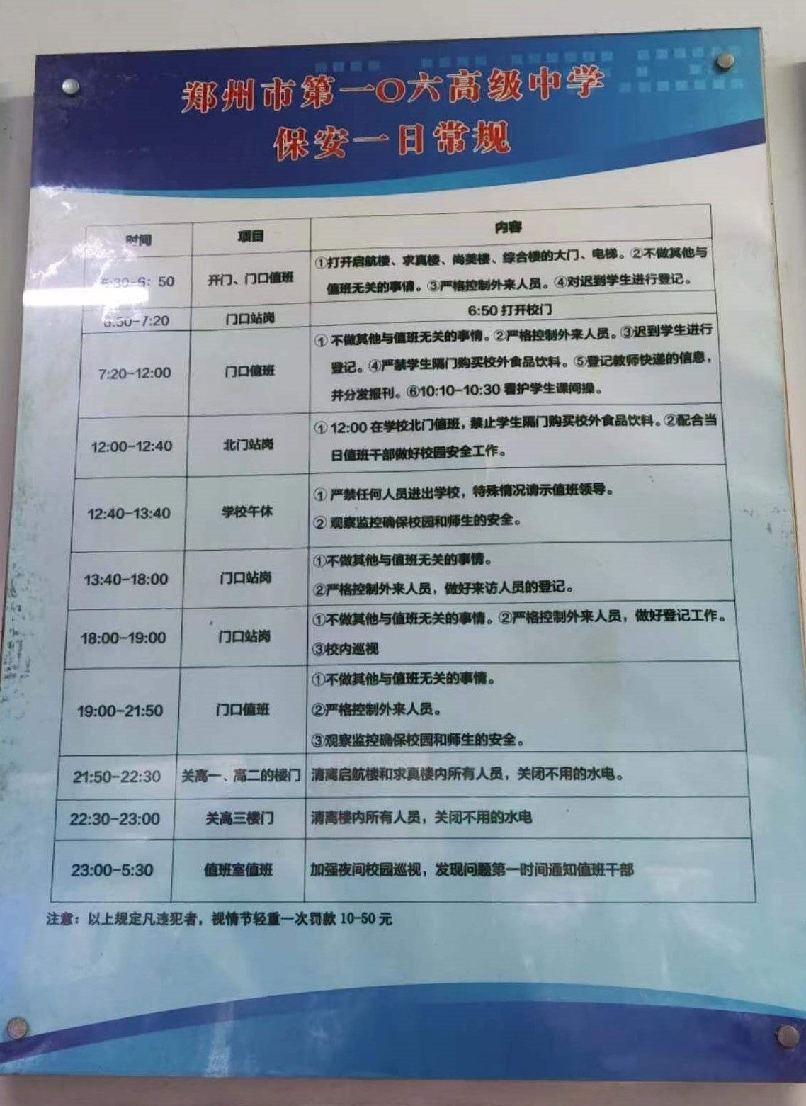范卫斌表示,日常值守一定要严格落实外来人员的进校管理制度,严防闲杂人员进入校园,提高防恐防暴的安全意识,紧绷安全弦,牢记安全法,坚决不做与值班无关的事情,一心一意保平安,全心全意促和谐。强烈的责任心是做好工作的基础,用规范文明的门岗值守行动擦亮郑州市第106高级中学和谐校园的窗口,把门岗值守打造成展现校园文明的风景线。