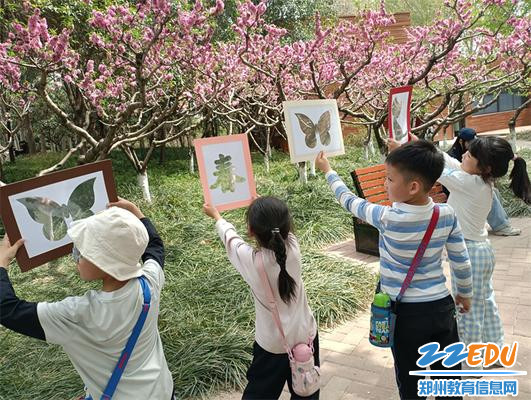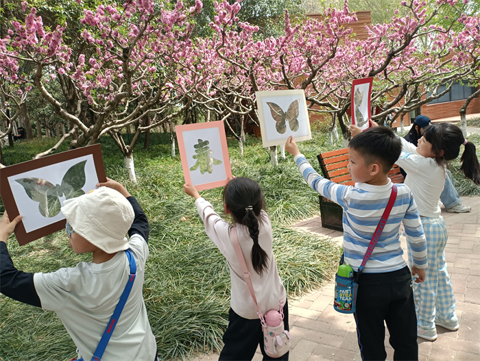 午后,孩子们来到郑州植物园,投身春日自然课堂。各班级分组开展活动:在“春天手工坊”,孩子们用花瓣、树叶制作书签和眼镜,巧手拼贴“黏土上的春天”;“植物小侦探”们穿梭林间收集不同颜色的叶片,触摸树皮纹路,辨识牡丹与芍药;“春日小画家”则用画笔记录树轮的年轮与枝头新芽,波波球写生、春天相框等创意形式让童趣充满植物园。