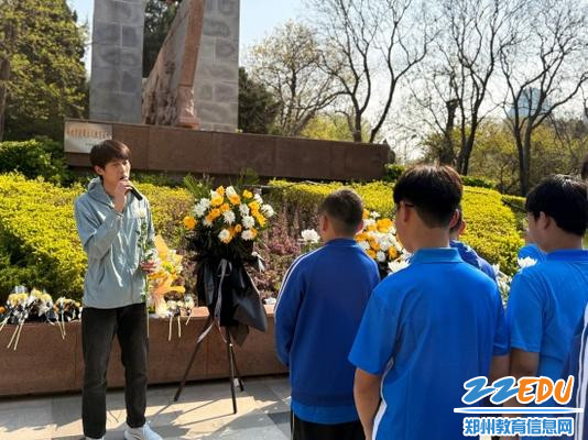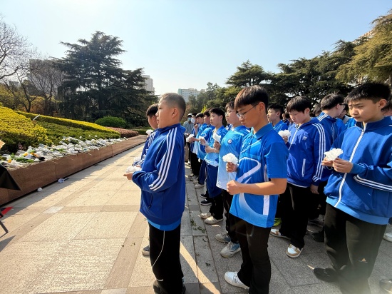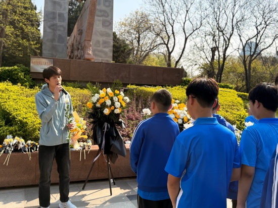 在庄严肃穆的三民主义亭前,学校历史老师孙懋生动讲解碧沙岗公园的由来,从命名的历史渊源,到 “碧血丹心,血殷黄沙” 的深刻寓意,一个个历史细节让师生们对这片红色土地的敬意愈发浓厚。全体师生郑重献上由学生们亲手折叠的小白花。九年级学生代表用铿锵有力的话语讲述革命先烈的英勇事迹,抒发新时代青少年赓续红色血脉、勇担时代使命的坚定决心。