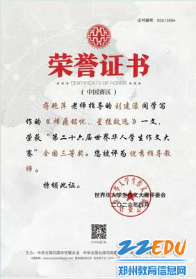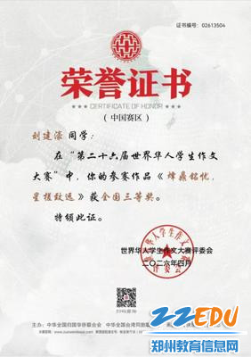 郑州市第十四高级中学学生刘建濠在“第二十六届世界华人学生作文大赛”中获全国三等奖