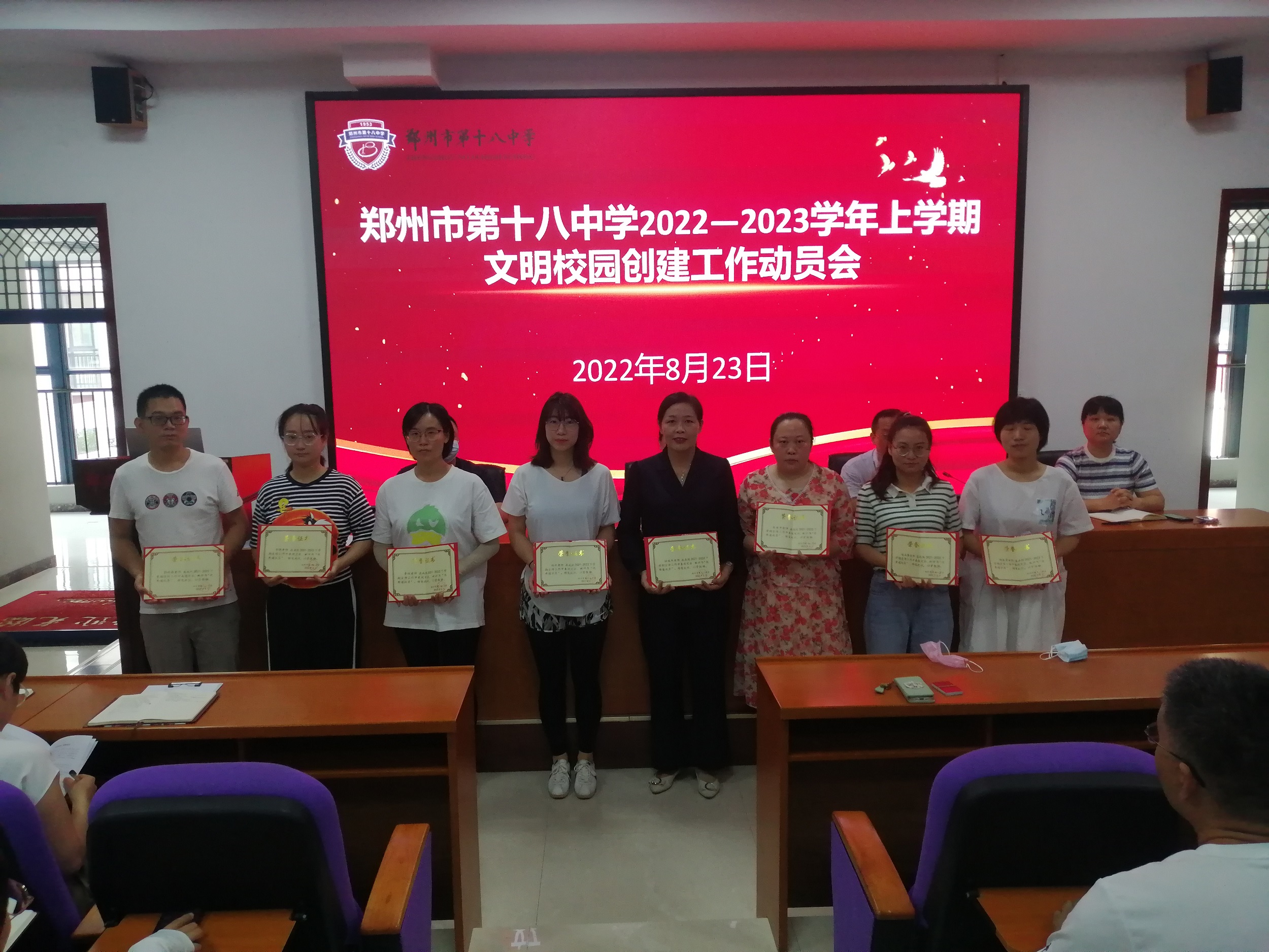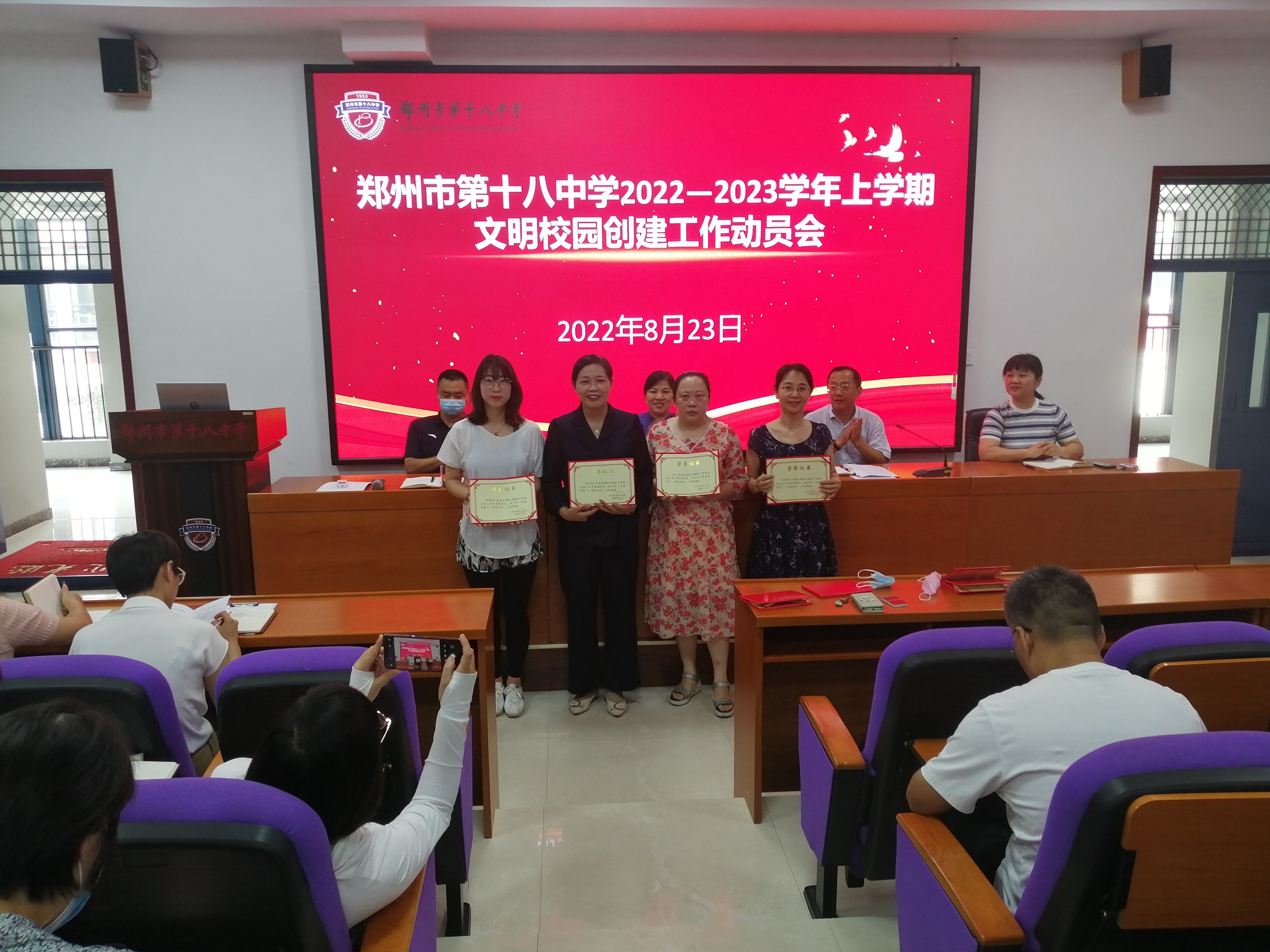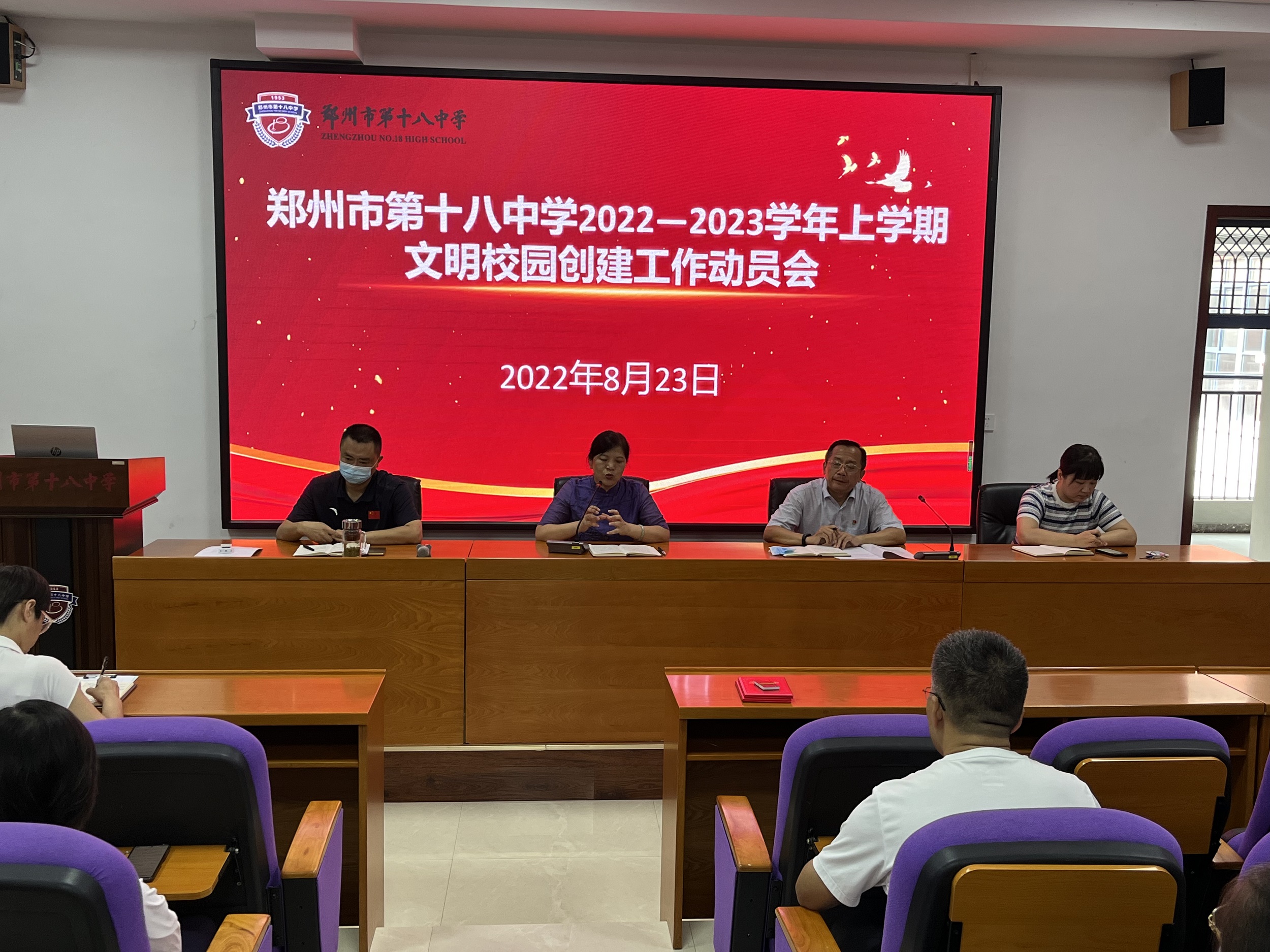 为全面贯彻落实郑州市文明办、二七区文明办关于深化全国文明城市创建工作的有关精神,切实巩固河南省文明校园创建成果,做好届满复审准备工作,8月23日上午,郑州18中召开2022—2023学年上学期文明创建工作动员会。校长段亚萍、党委书记魏勇、副校长倪海军、工会主席张恺出席会议,全体教职工参加本次会议。