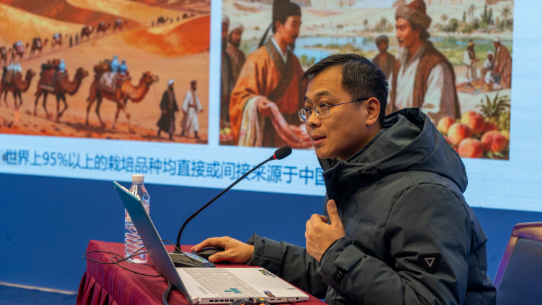 曾文芳博士以桃为例,带领同学们经历了一场从“寻根问祖”到“未来展望”的科学之旅。他结合生物、地理、化学等多学科知识,讲述了桃起源于中国西北的科学依据、沿丝绸之路传播的历史,以及现代育种如何通过“辣手摧花”式的人工杂交授粉,将父本母本的优良性状聚合。讲座还揭秘了分子标记辅助选择等前沿技术如何像“基因检测”一样,大幅缩短育种周期,实现“优生优育”。