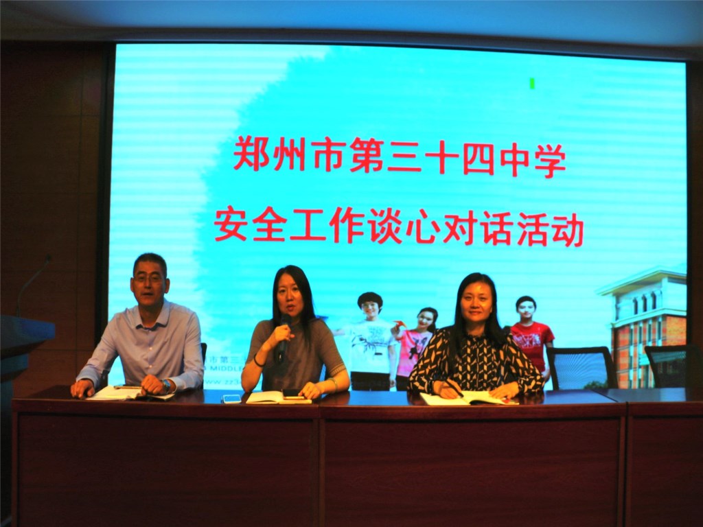 2018年9月18日下午,郑州34中在二楼报告厅开展安全工作谈心对话活动。学校领导班子成员校长易峰、副校长孙爱军、王远荣参加会议,校长易峰进行讲话和安全工作部署。