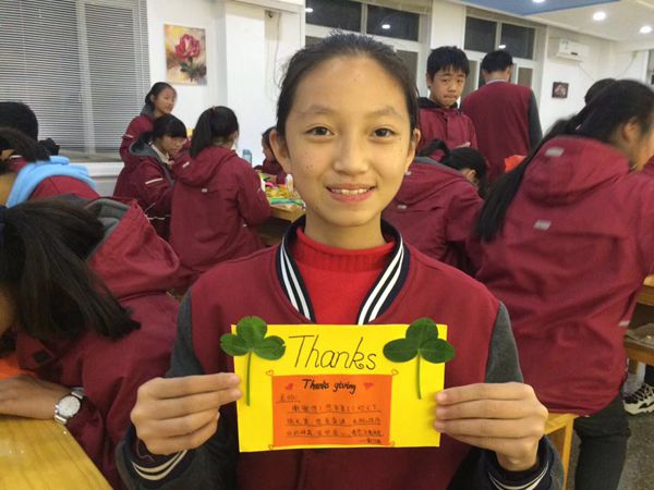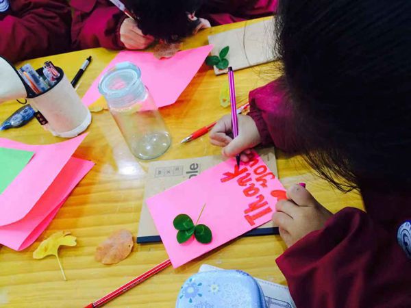 活动现场,杜伟老师带领大家回顾了中国历史上感恩事迹,社团辅导教师王立夏全英讲解西方感恩节历史。随后,模联社成员集体朗诵诗歌“我感恩”,现场制作感恩贺卡,书写感恩之言向最敬爱的老师献礼。制作感恩贺卡的材料取源于北龙湖湿地公园银杏林落叶,三叶草取源于植树人废弃的垃圾桶旁……废物利用,感恩大地的馈赠。社团成员张照依阳说:“在制作感恩节贺卡的活动中,我感受到了每一位同学真挚的情感。非常感谢老师能给我们这个机会把贺卡送给自己最感激的人。感恩身边的人,感恩父母、老师、朋友,感恩祖国,感恩大自然。”