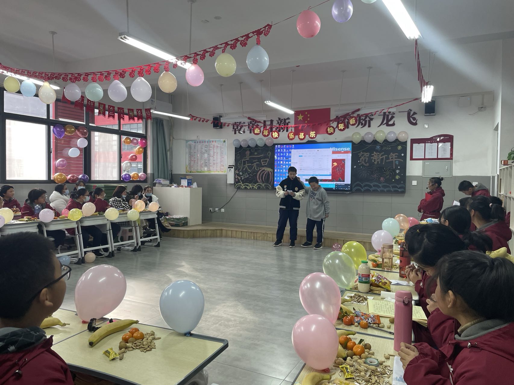 活动第二阶段,各班级以班为单位举行元旦庆祝活动。在元旦庆祝活动中,孩子们”八仙过海,各显神通”,精心布置了教室,认真准备唱歌、跳舞、相声、小品等精彩的节目,并邀请各任课老师观看,全体师生皆积极参与其中,在欢快的氛围中密切了师生关系,也表达了对新的一年的美好憧憬与希望。