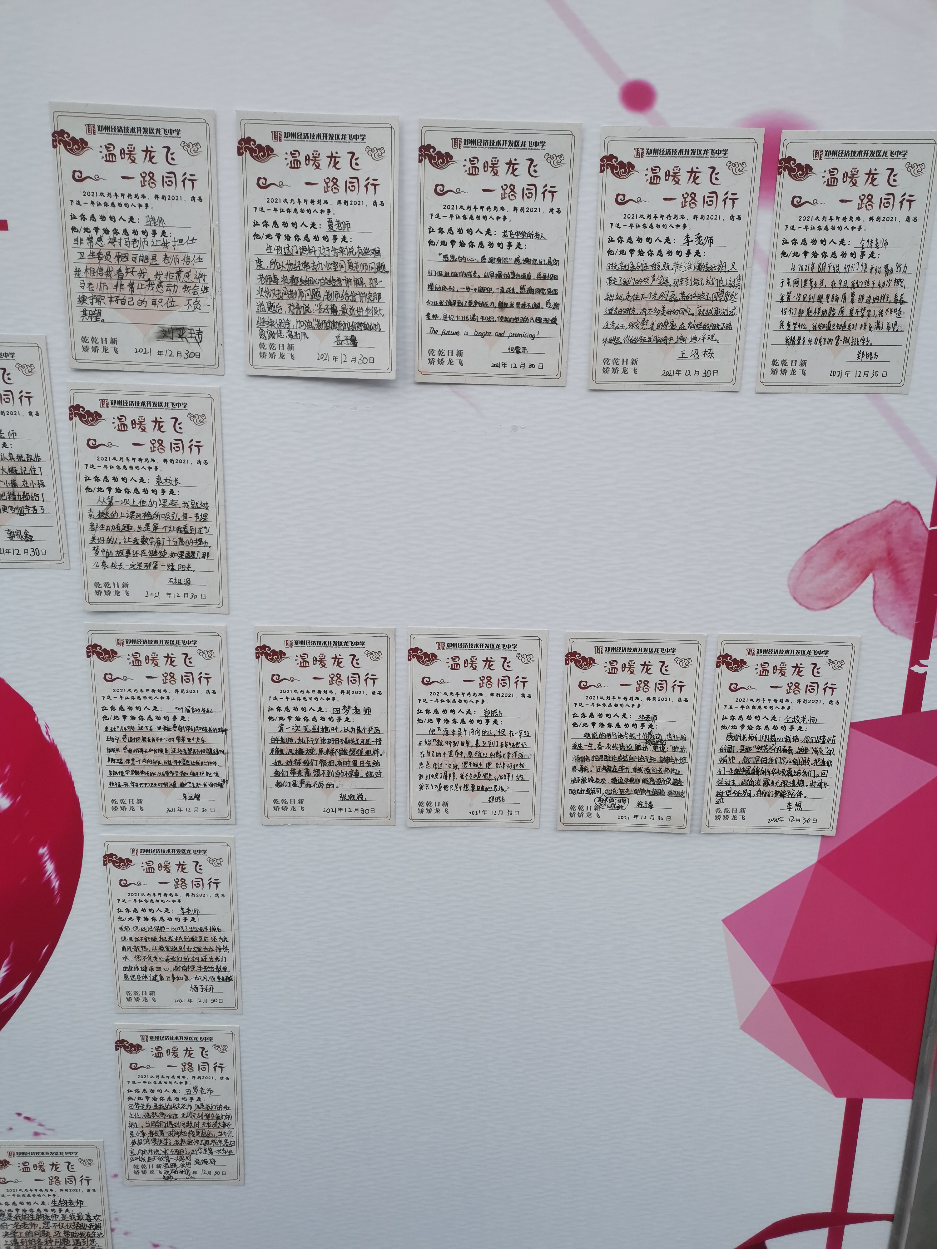 挥别2021,写出心中的感动,期盼2022,说出新年的愿望。此次元旦系列活动以辞旧迎新为契机,激励学生心怀善意和美好,带着希望和期冀迎接新年。培养提升学生的感恩意识,营造积极向上的校园文化氛围。新的一年,各位龙飞人在温暖和感动里相识,在砥砺奋进中继续腾飞。