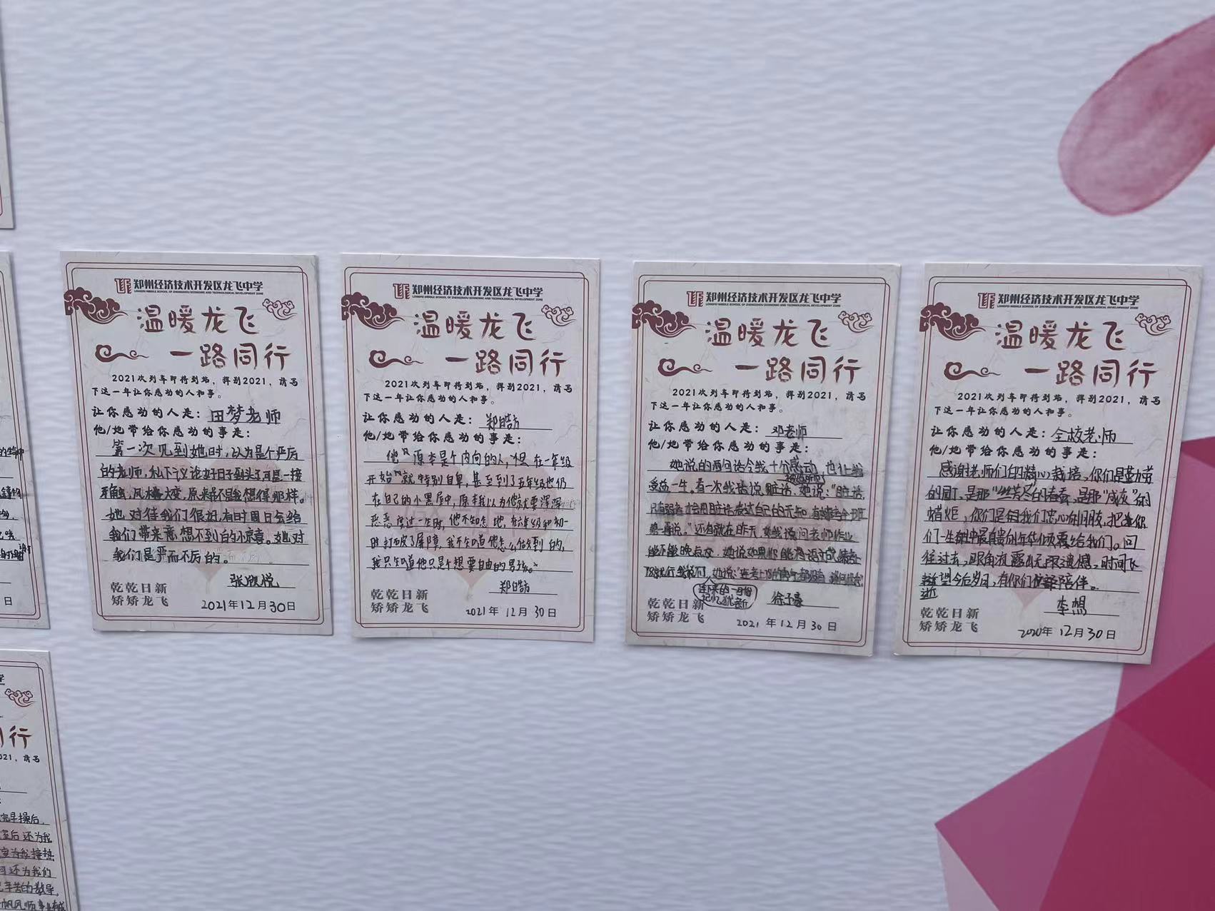 活动第一阶段,主题为“挥别2021,写出心中的感动”的写心愿卡活动于12月30日下午正式拉开序幕。本次活动为每名同学及老师发放两张特制心愿卡,让全体师生借助元旦节日契机,回顾梳理总结2021年成长与经历,汲取正能量,写出温暖感动你的那些人和那些事。每位学生填写两张感动卡,一张送给让自己感动的人,一张在班级交流。孩子们在活动中回忆这一年的收获与感动,感恩老师和同学,写出对新的一年的期盼,字字句句里流露出真挚的情感。