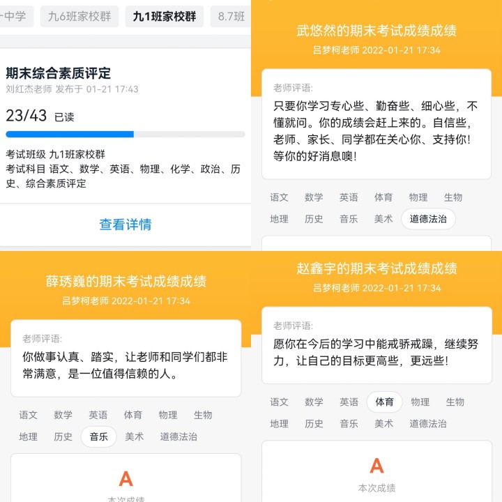 随后,各班召开线上家长会,班主任从假期时间安排、假期学习计划、寒假安全注意事项、给家长的建议几方面召开会议。同时,在“双减”的大背景下,郑州六十中严格按照上级要求对学生的综合素质进行评价,班主任评价标语新颖亲切且有针对性,并对学生之后的学习提出了更高的要求。