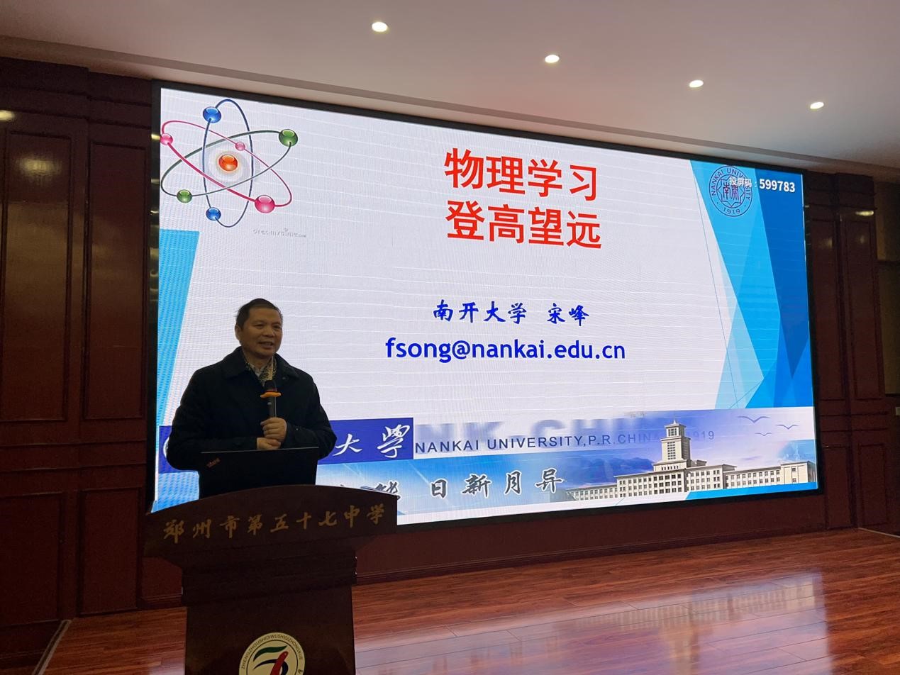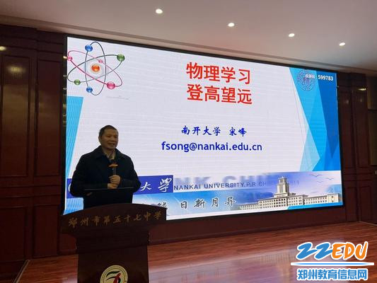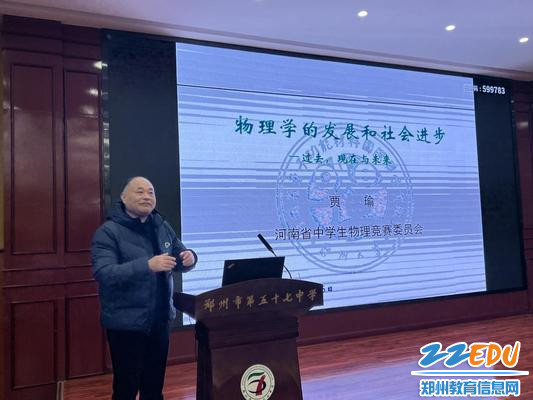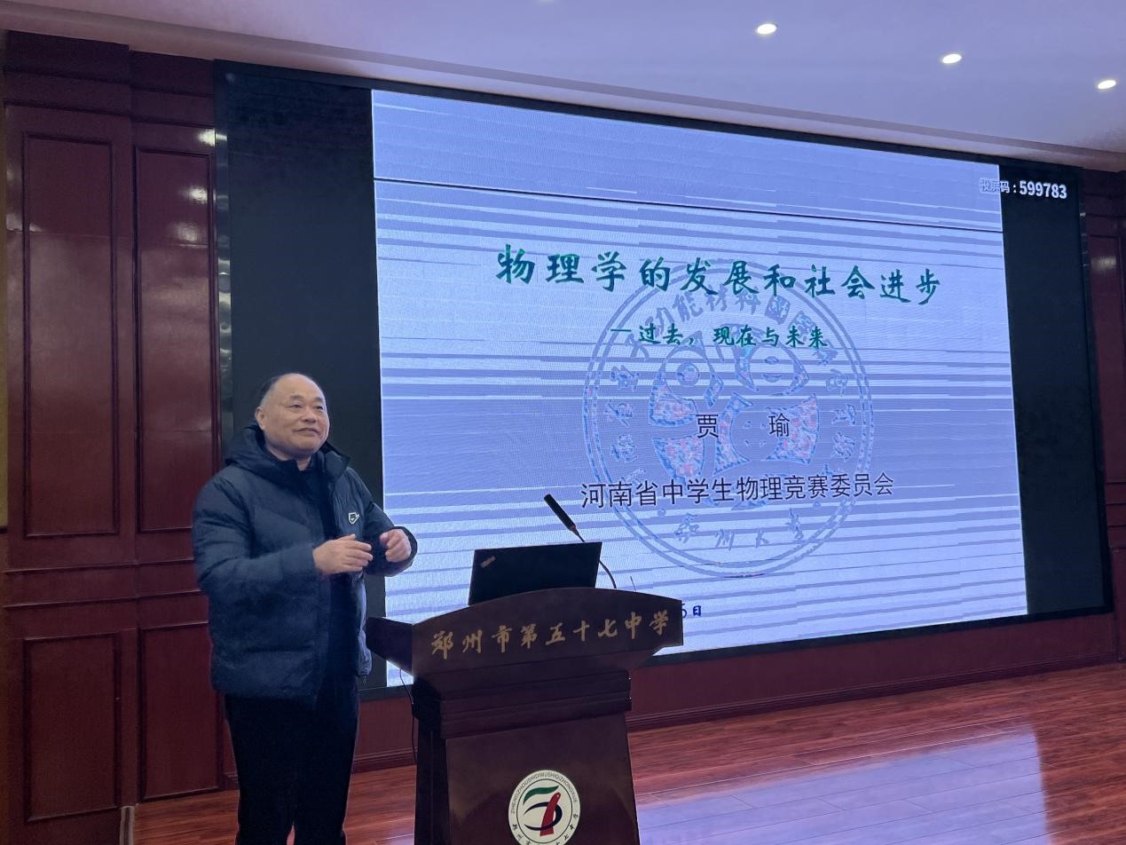 会议由郑州市第五十七中学副校长殷超英主持,物理奥林匹克竞赛中国国家队总教练兼领队宋峰、河南大学物理特聘教授贾瑜、郑州一中竞赛部主任魏春雷受邀出席本次讲座活动。