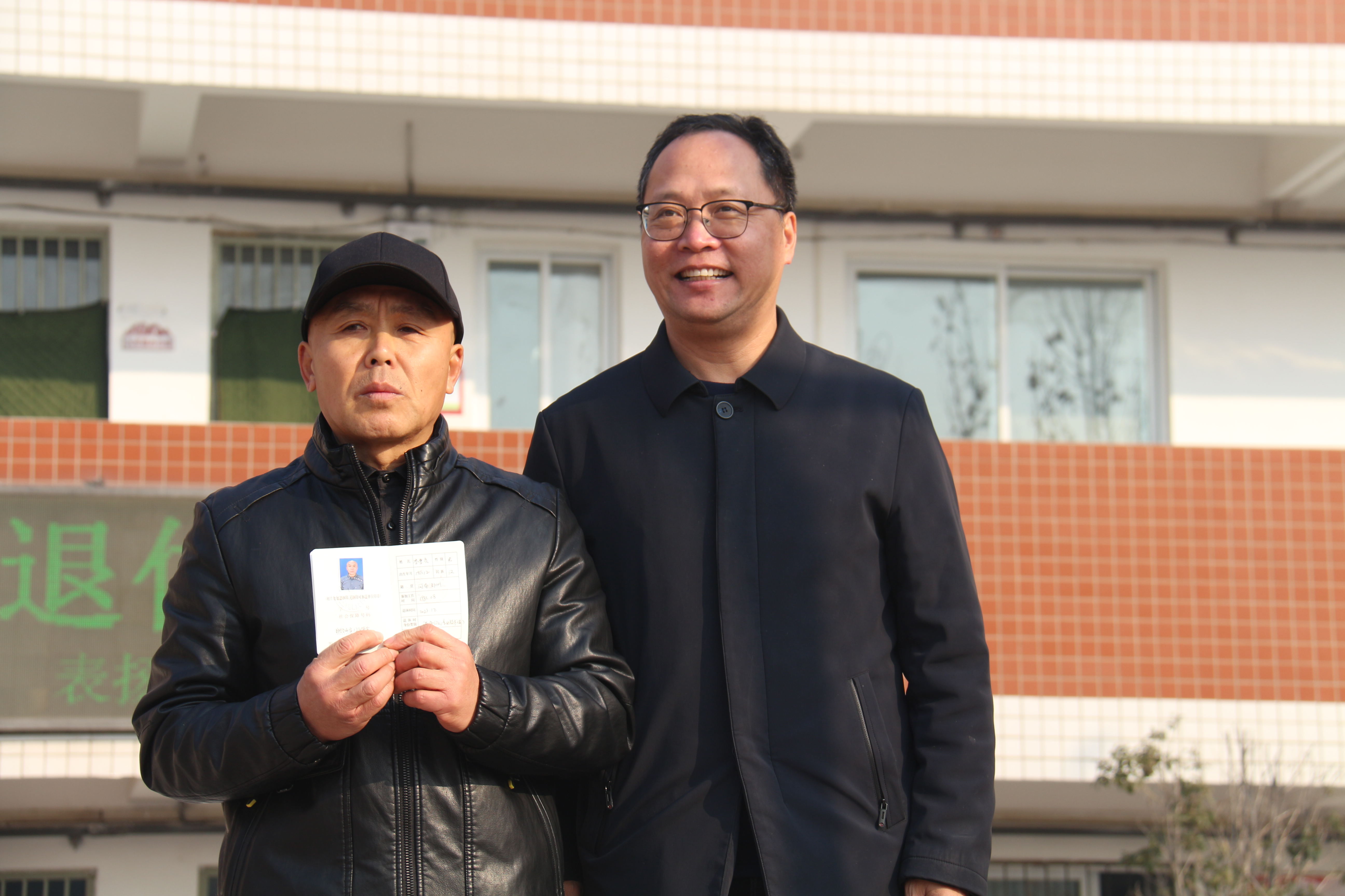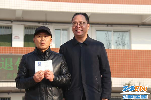 郑州经开区九龙中学校长张保安为李雪亮老师颁发退休证