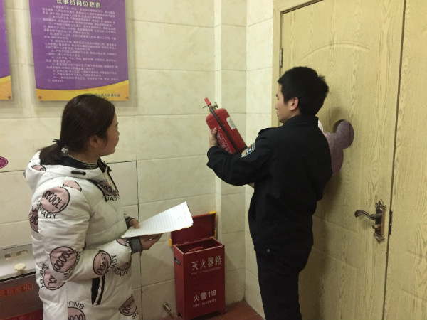 民警在走廊查看灭火器