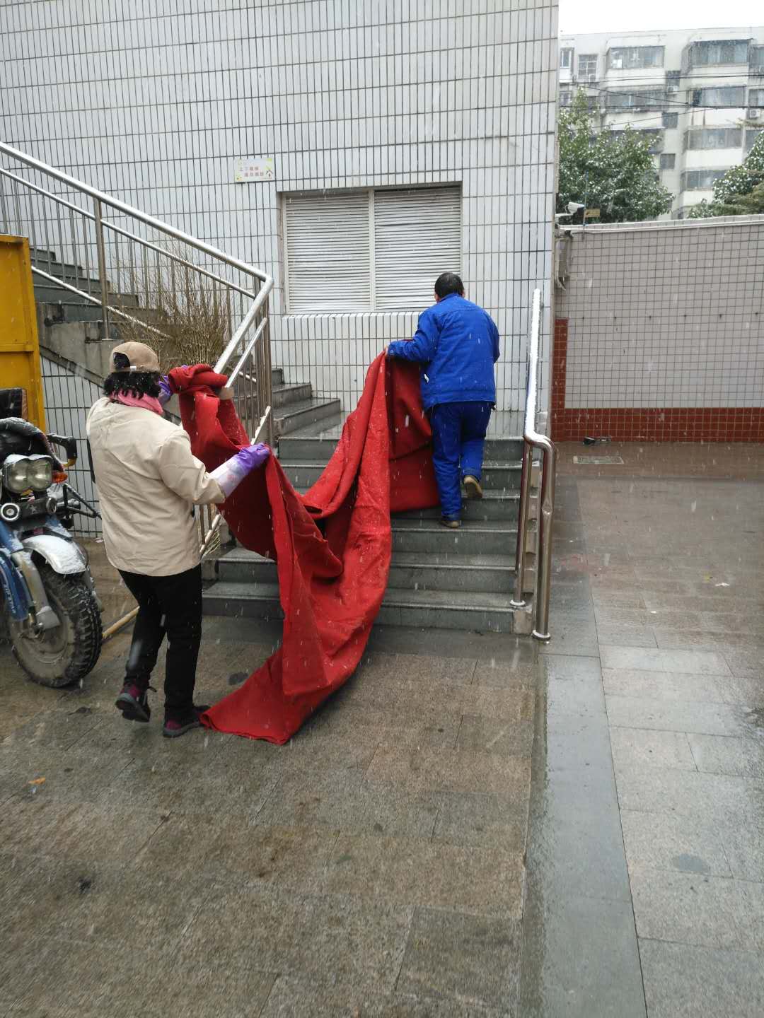 1月9日,郑州迎来了2019年的第二场雪,雪给我们带来了冬天的气息,也把冬天的校园装扮的更加美丽了。大雪纷飞中,郑州45中总务处主任李超带领相关工作人员,及时在学校各个教学楼楼梯口、学生厕所门口、校园主干道等学生主要行走地段,铺设防滑毯,为学生开辟一条条安全通道。