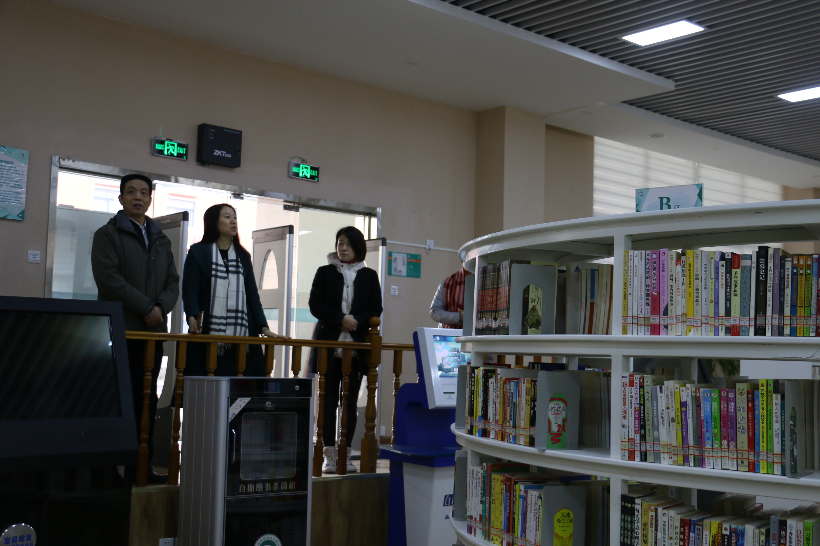 专家们参观了学校现代化的阅览室。阅览室由传统图书借阅向多元化、智能化方向发展。阅览室用别致的弧形书架,营造出书香四溢的高雅、静谧空间。在阅览室内,还摆放着两排电子阅读机,搭建数字图书馆平台,为读者提供文献查询、数字阅览等智能便利的服务,充分体现了书香校园的特色。