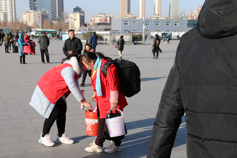 看到一位拄着双拐的残疾人旅客,志愿者把春节的大礼包递上后,扶着他进入站内候车,这位旅客非常感动。一位旅客带着她的一对龙凤胎孩子中途在郑州转车,志愿者把“福”字送给她,全家人非常开心。“第一次来郑州,就让我感受到你们的温暖,谢谢!”这位旅客言语间透着欢喜和感动。志愿者又为广场上的环卫工人送上春节大礼包,并为他们围上温暖的围巾,环卫工人被汩汩暖流所感染。