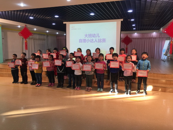 在比赛过程中,孩子们个个信心满满、跃跃欲试,只见小班孩子们手脚麻利地迅速穿爹衣物、穿鞋子;中班的小朋友有条不紊地将餐具归置整齐;大班的孩子更是抱着永争第一的心态进行比赛,都以自己最快的速度叠放被子。孩子们都拿出了十二分的努力,有的孩子虽然动作有些迟缓,但他们仍然认真地完成一系列动作,脸上表现出不服输的神情。整个比赛过程既紧张又激烈,开心快乐的笑容始终展露在每个孩子的脸上,最后,由家长代表为每位获奖的小选手颁发奖状。