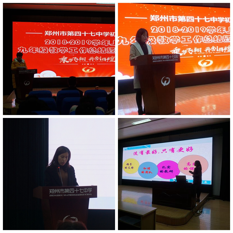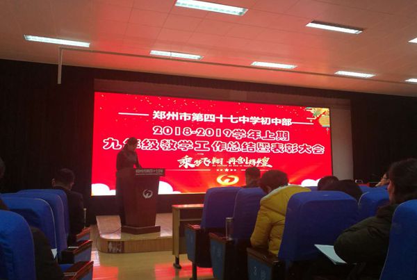 郑州47中初中部执行校长肖国红做总结发言。她对今天下午各位老师的发言给予了高度评价,对本届九年级给予厚望,并对下一阶段的教学及管理工作提出新的要求和期许。会议结束前,肖国红代表学校领导班子向在座的老师们表达了新春祝福,相信九年级在学校各级领导的关怀和带领下,必将乘“四园梦”飞翔,在明年的中考中再创辉煌。