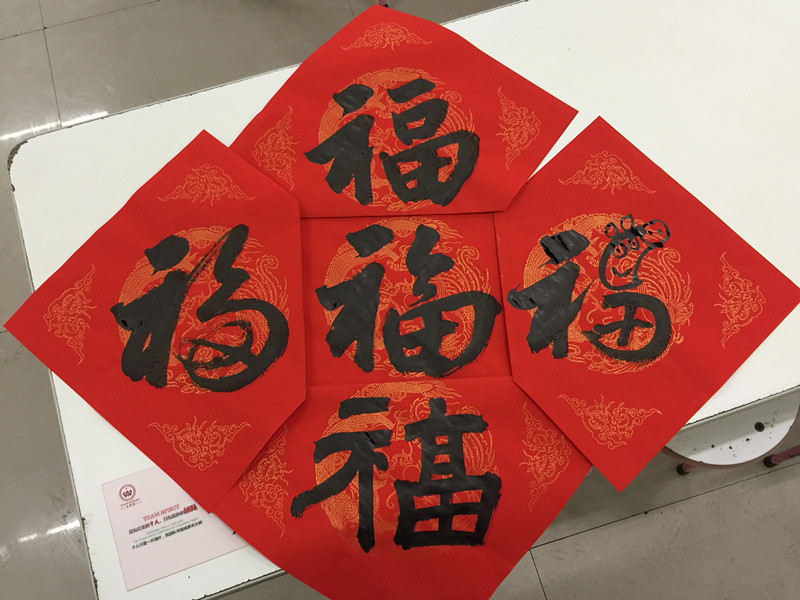 书法老师笔锋游走,片刻间,一行行遒劲有力、清爽洒脱的春联跃然纸上。各种字体的“五福”配齐,其中有一幅很有创意的“福”字最引人注目,“田”字上面的小猪“佩奇”,萌萌哒,赢来了阵阵掌声。