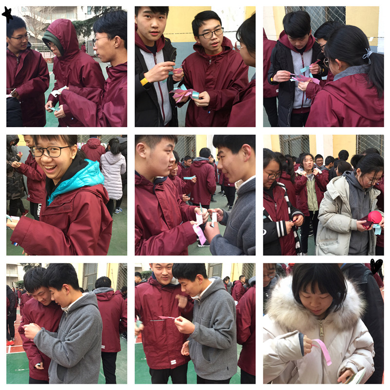 猜灯谜、写春联两个活动区域既相互烘托,又相得益彰。小操场上,爱中这个大家庭热闹非凡,洋溢着喜庆、欢乐的节日氛围,散发着浓浓的年味。300余条彩色灯谜挂在一根根细绳上,呈一字摆开。谜语内容丰富,涵盖字、词、动植物、生活物品、日常用品、科技名词等,又充满文化色彩,生动有趣,既具娱乐性,又具知识性。同学们积极参与,或苦思冥想, 绞尽脑汁;或独自思考,认真琢磨;或三五成群,相互讨论;或揭开谜底,喜笑颜开......一片片欢声笑语。谜底陆续被一个个揭晓,同学们争先奔向兑奖台,开心地领到奖品,脸上荡漾着幸福满足的喜悦。