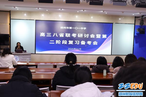 为精准把握2025年高考方向,提升高三备考质量, 1月14日下午,郑州市第一〇一中学在学校图书馆二楼报告厅召开高三年级八省联考质量分析暨第二阶段复习备考会。学校校长谭纪萍、副校级干部井源源及高三全体教师参会。