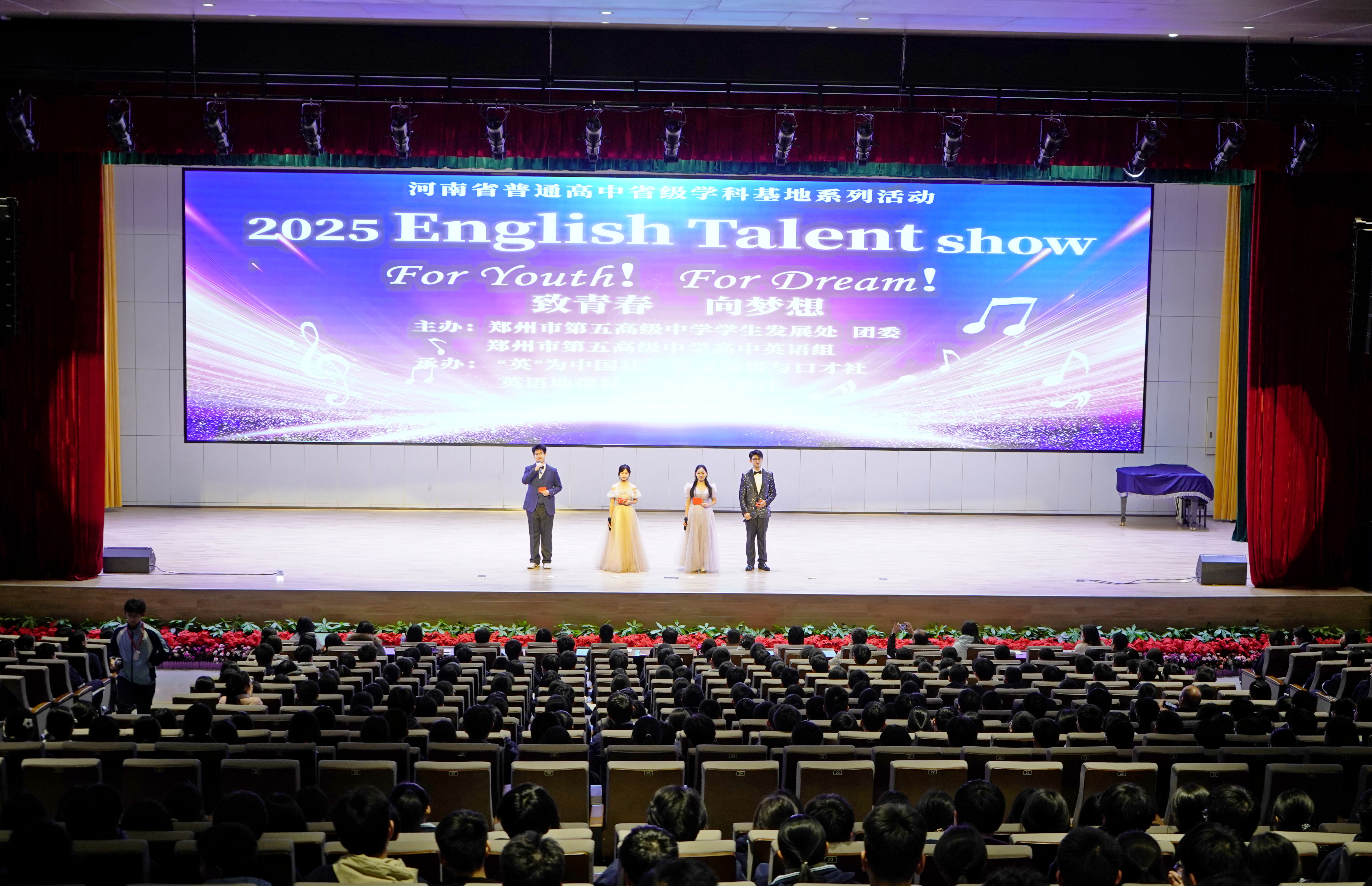1月9日,郑州市第五高级中学第十一届“致青春·向梦想”英语“好声音”文化节在该校艺术中心开展,学校高一年级师生及部分家长代表共800余人共同见证这场融语言之美、艺术之韵与青春之力于一体的文化展演。