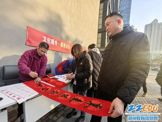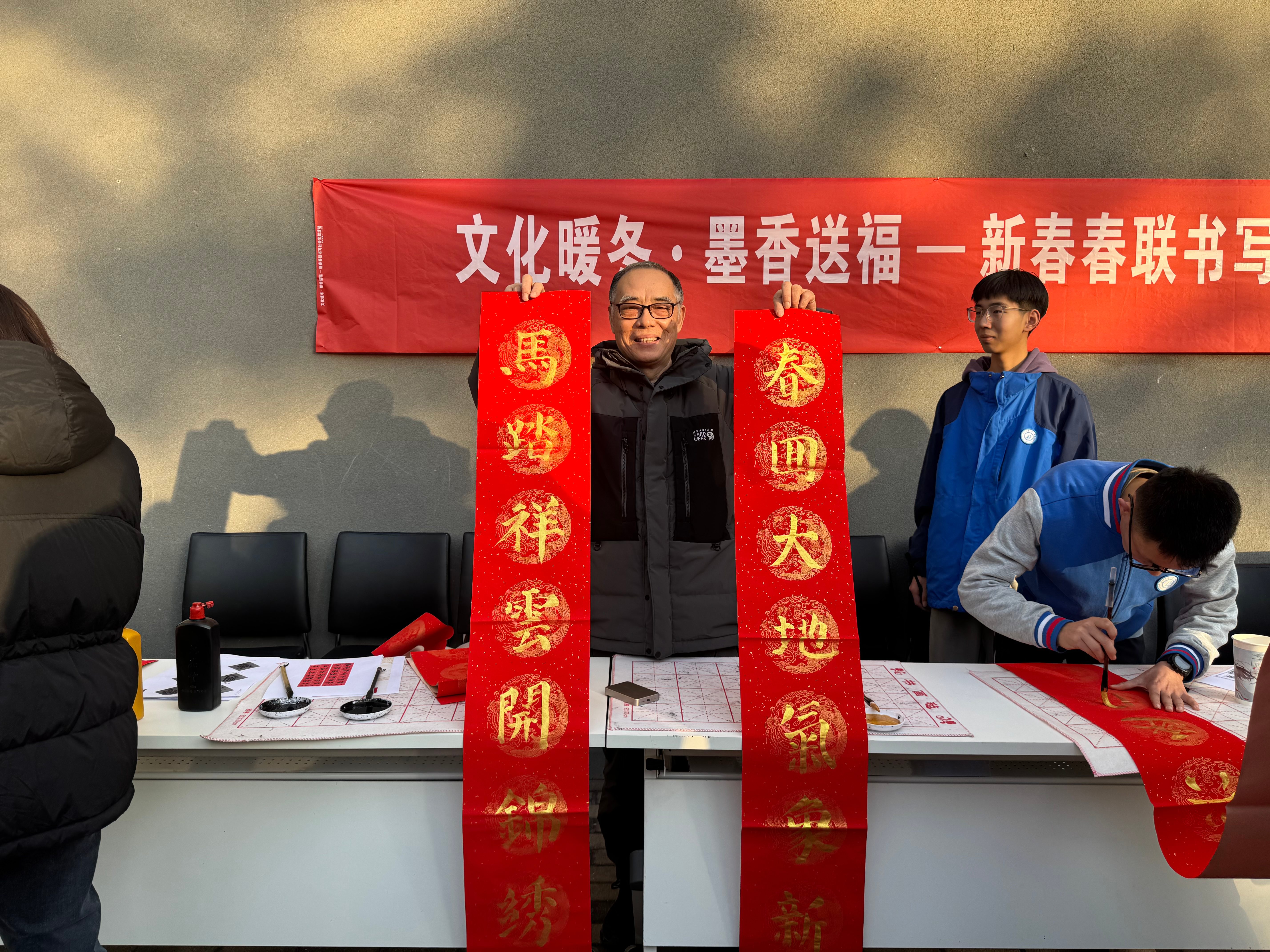 为传承中华优秀传统文化,彰显近百年名校的文化底蕴与育人担当,1月15日下午,郑州市第一〇一中学工会、团委联合书法社共同特邀专业教师胡永江,在郑东商业中心广场举办“校园文化行・新春送祝福”手写春联送祝福活动。退休教师、在职教师与学生书法爱好者齐聚一堂,以笔为媒、以墨传情,为市民送上新春祝福。