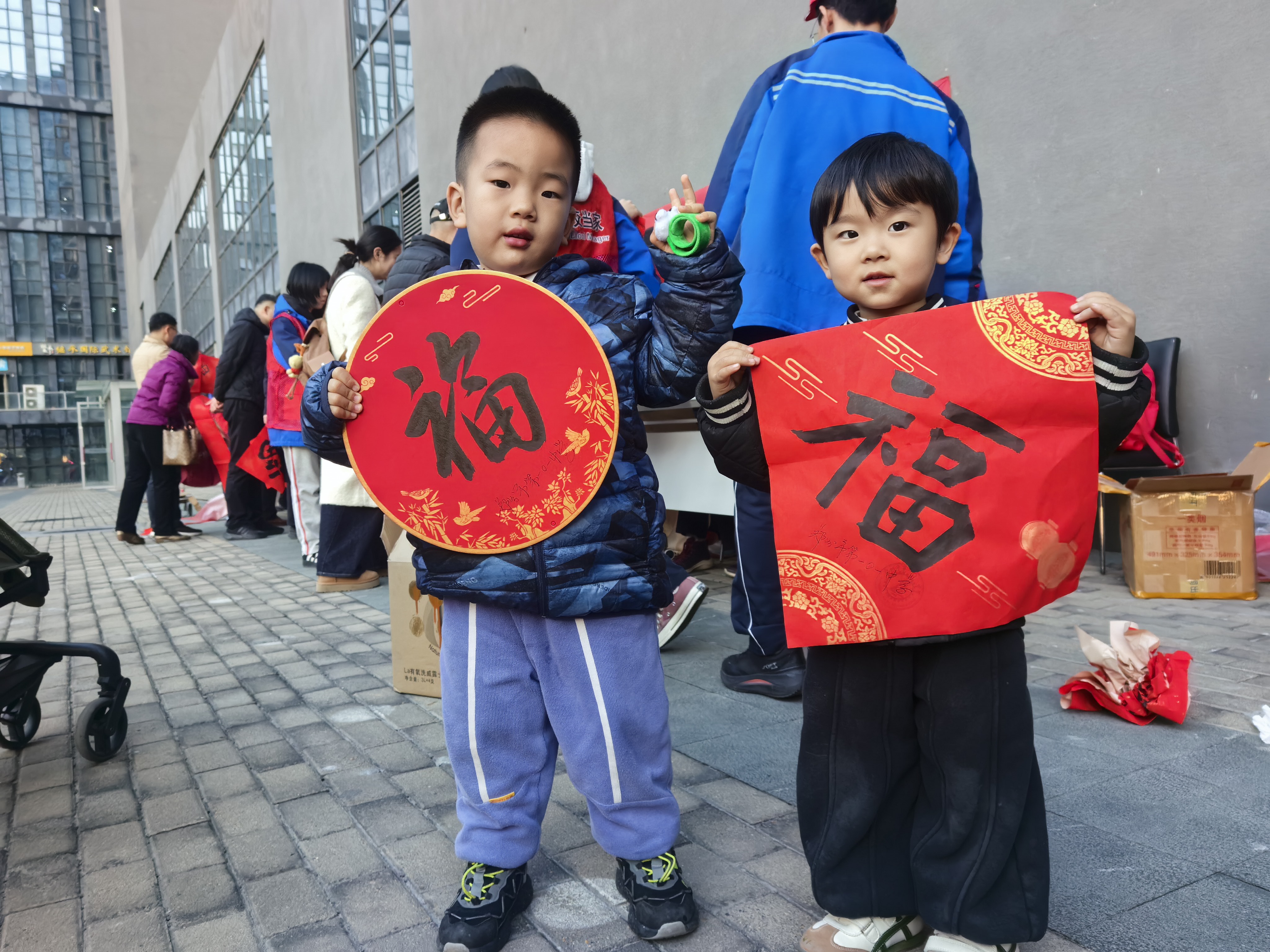 活动当日,郑东商业中心广场暖意融融、墨香四溢。书写现场被市民层层围住,大家或驻足欣赏,或轻声交流。书法爱好者们凝神运笔,隶、楷、行、草各体纷呈:离退休教师笔力沉稳,在职教师挥洒自如,学生作品虽显稚嫩却充满朝气。“龙腾瑞气入千家,春满神州迎福来”等寓意吉祥的春联与“福”字,备受市民欢迎,现场洋溢着一片欢声笑语。