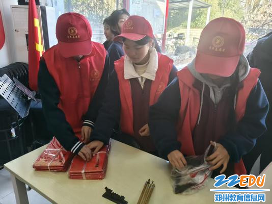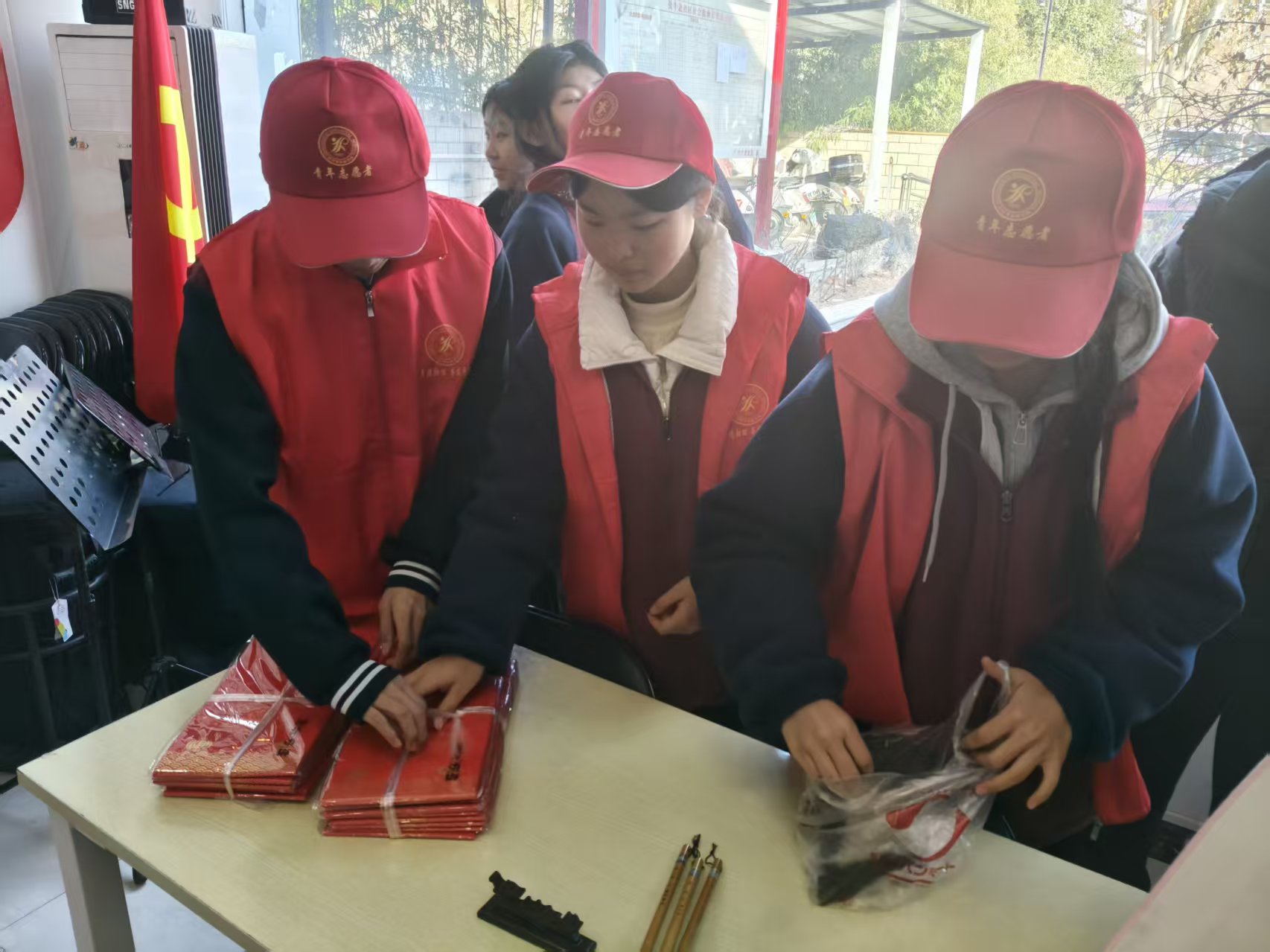 志愿者们精心为派发春联做准备