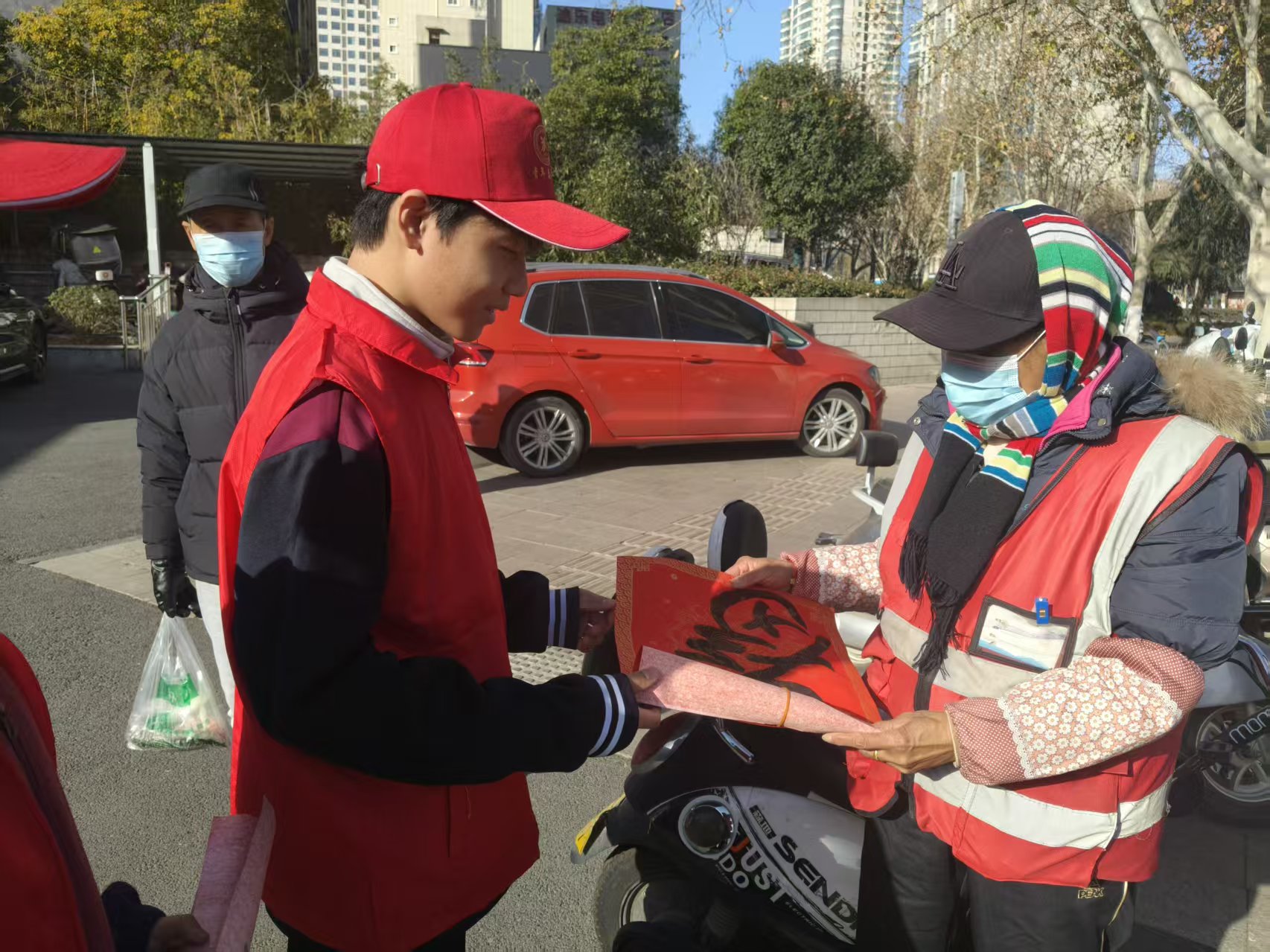 志愿者向社区居民送春联、福字,寄托节日祝愿