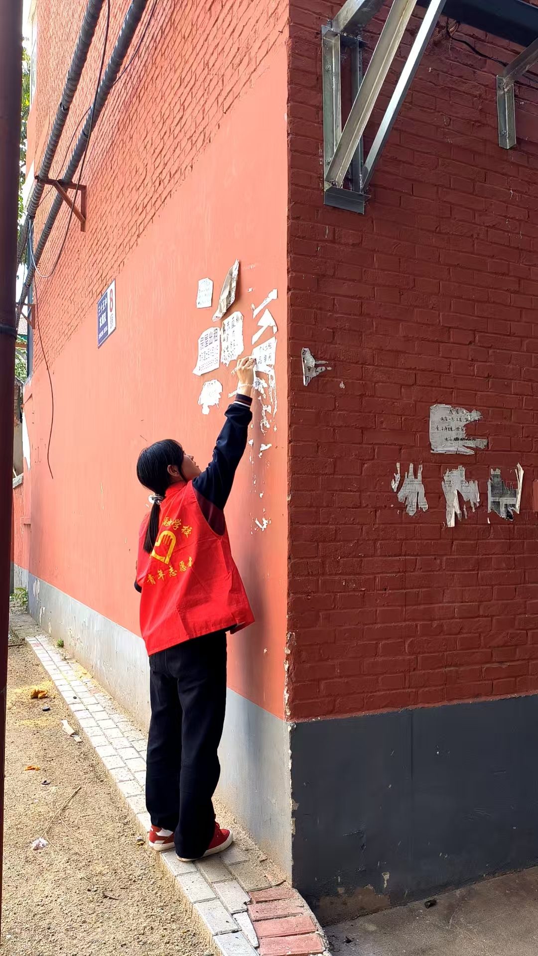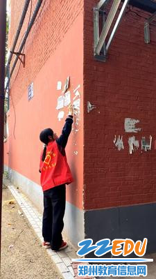 志愿者耐心清除社区墙面小广告
