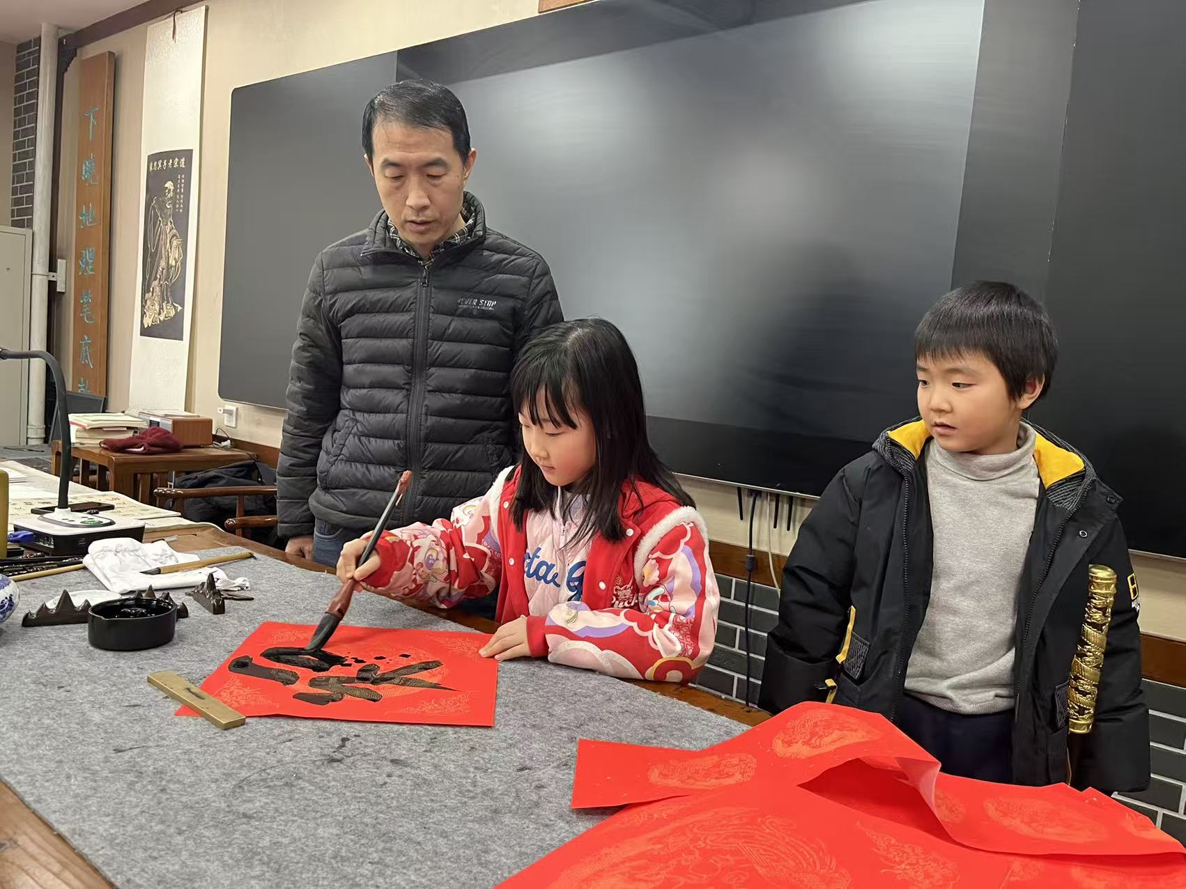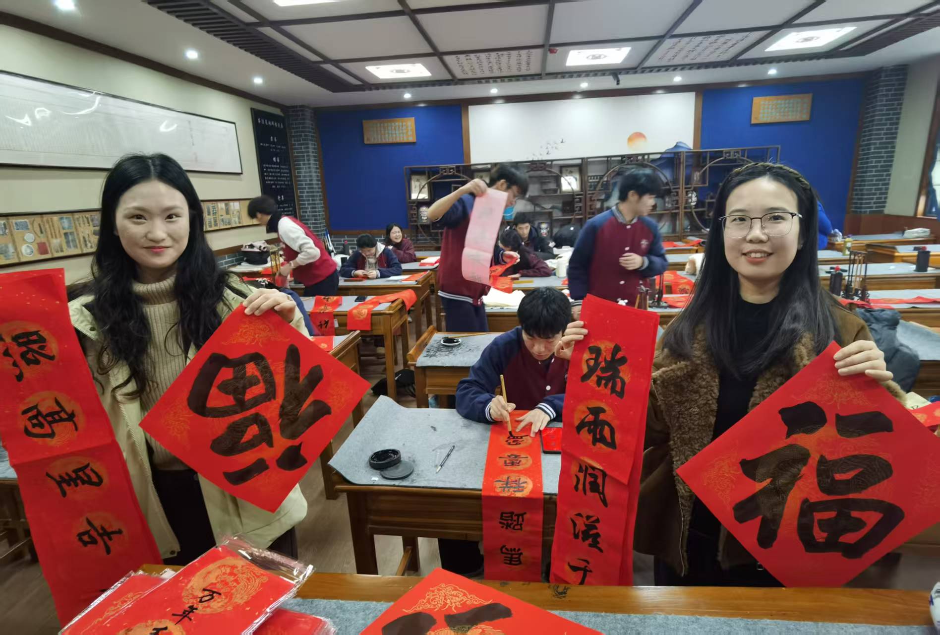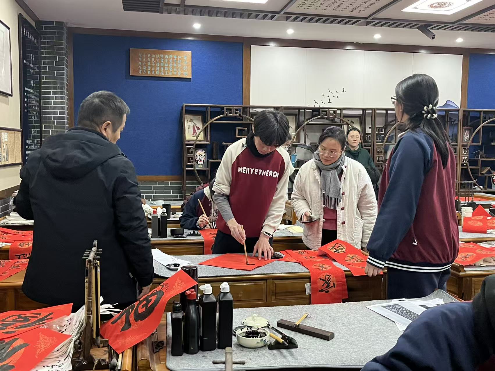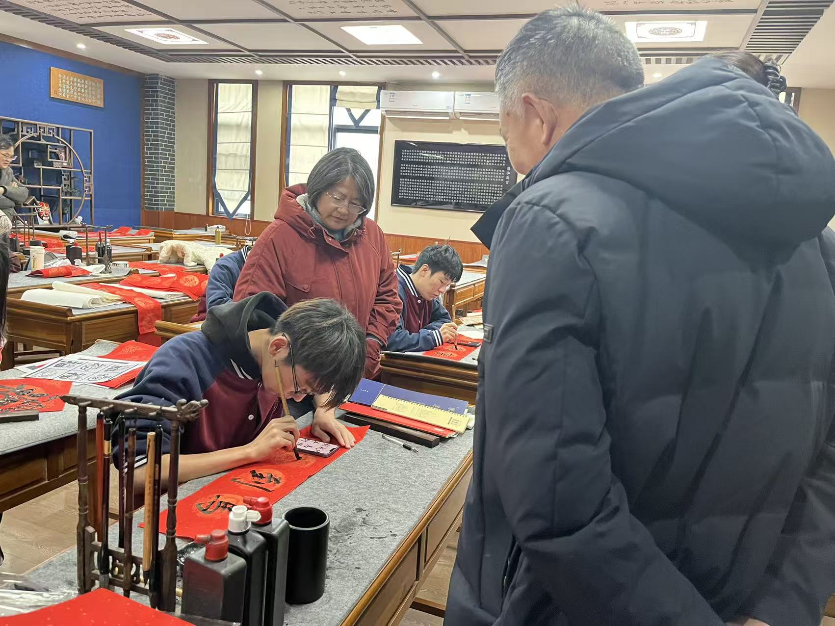 有的教师为了给教室营造浓厚的学习氛围,耐心地在现场等待学生创作;有的教师看到喜欢的春联,现场争相预订。