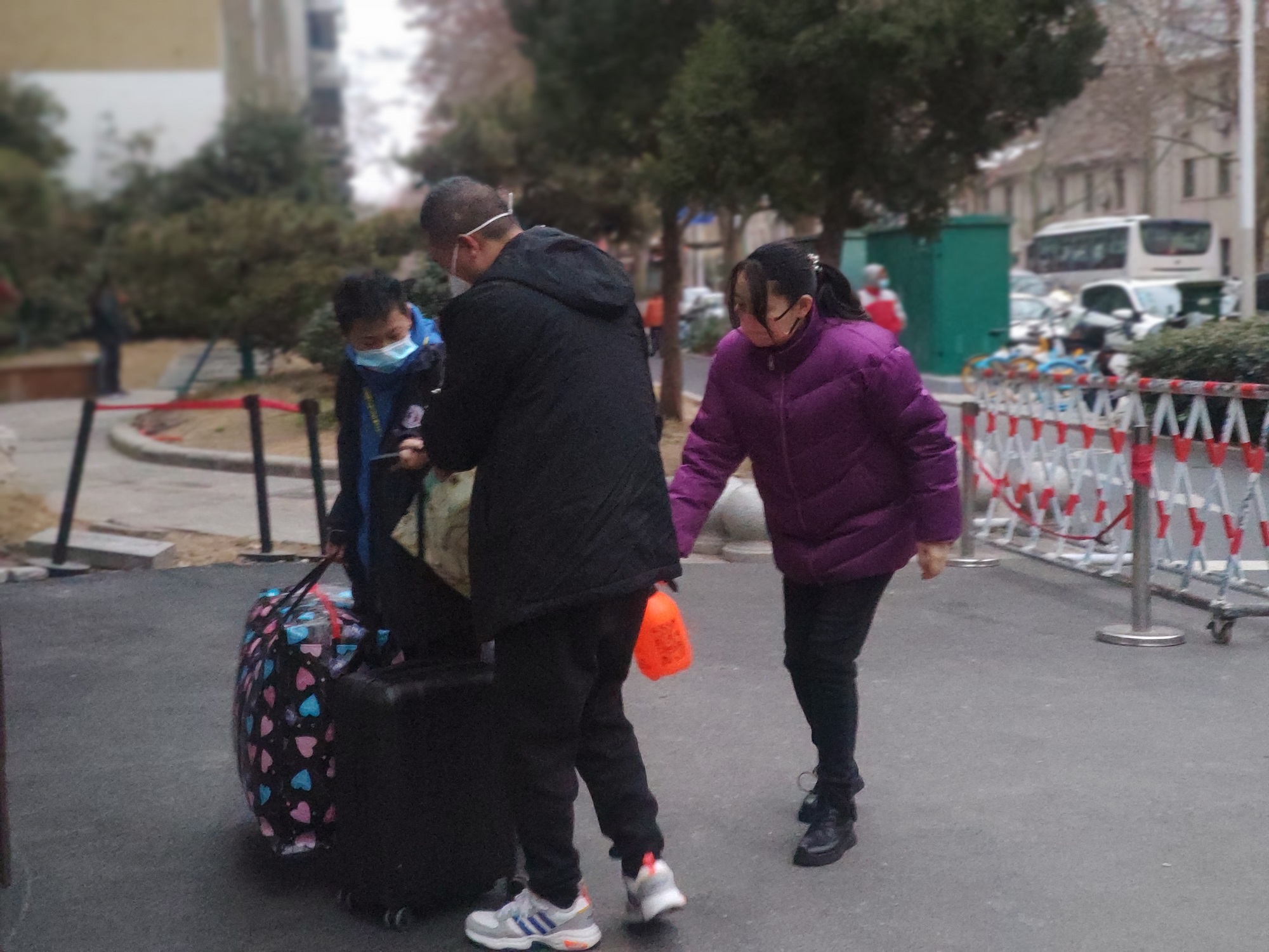 2月16日早上6:30,学校政教处老师、安保人员组成的搬运小分队已经等候在寒风里,帮助学生消杀、运送行李,他们全力引导防止学生聚集,并帮助拿行李,一趟趟往返在大门与寝室之间。家长们看到老师们的贴心服务、爱心护送,纷纷点赞。