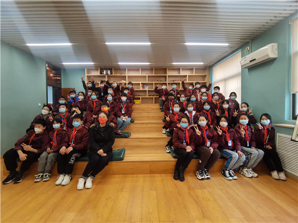 参观学习的小学生在学校合唱教室合影留念
