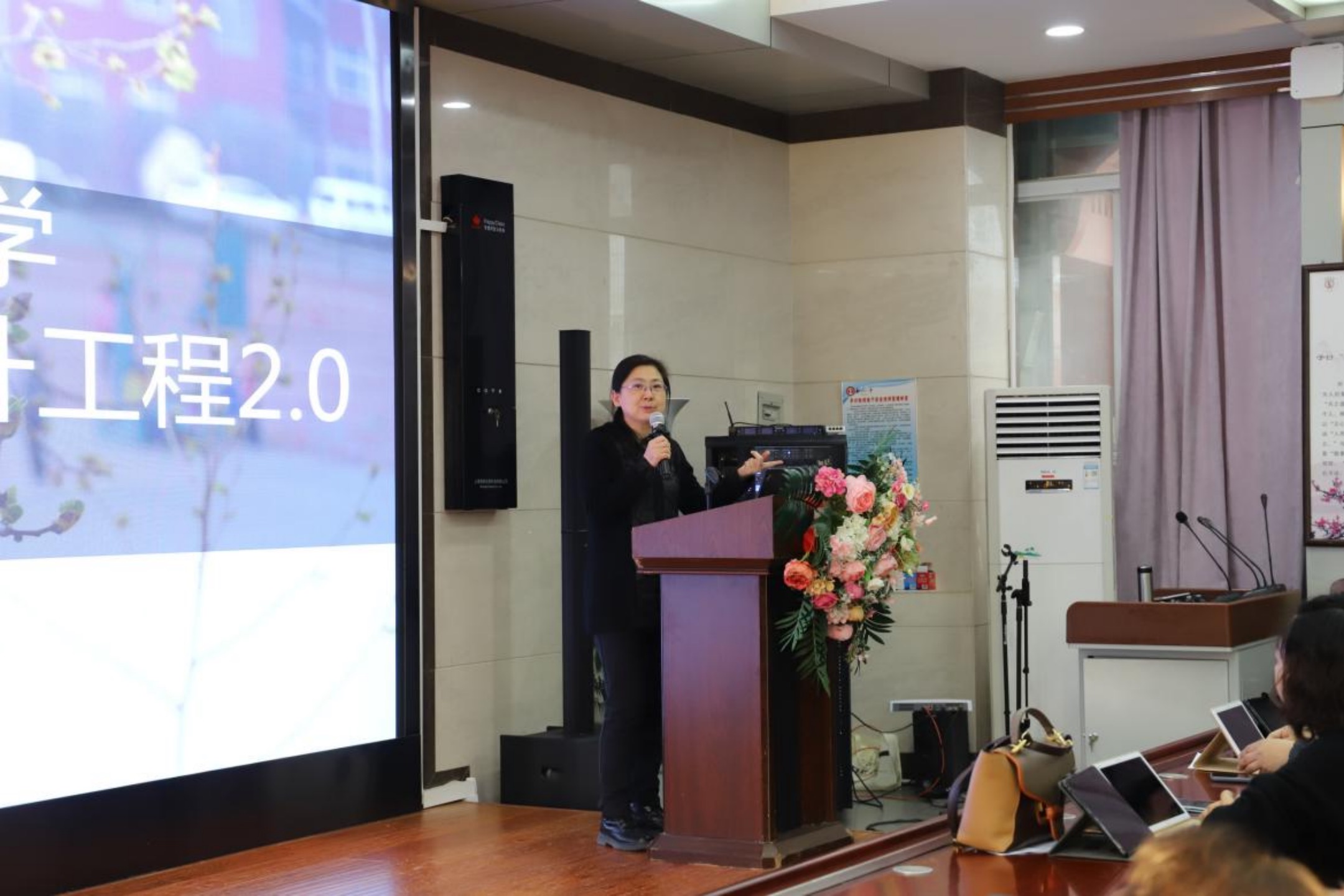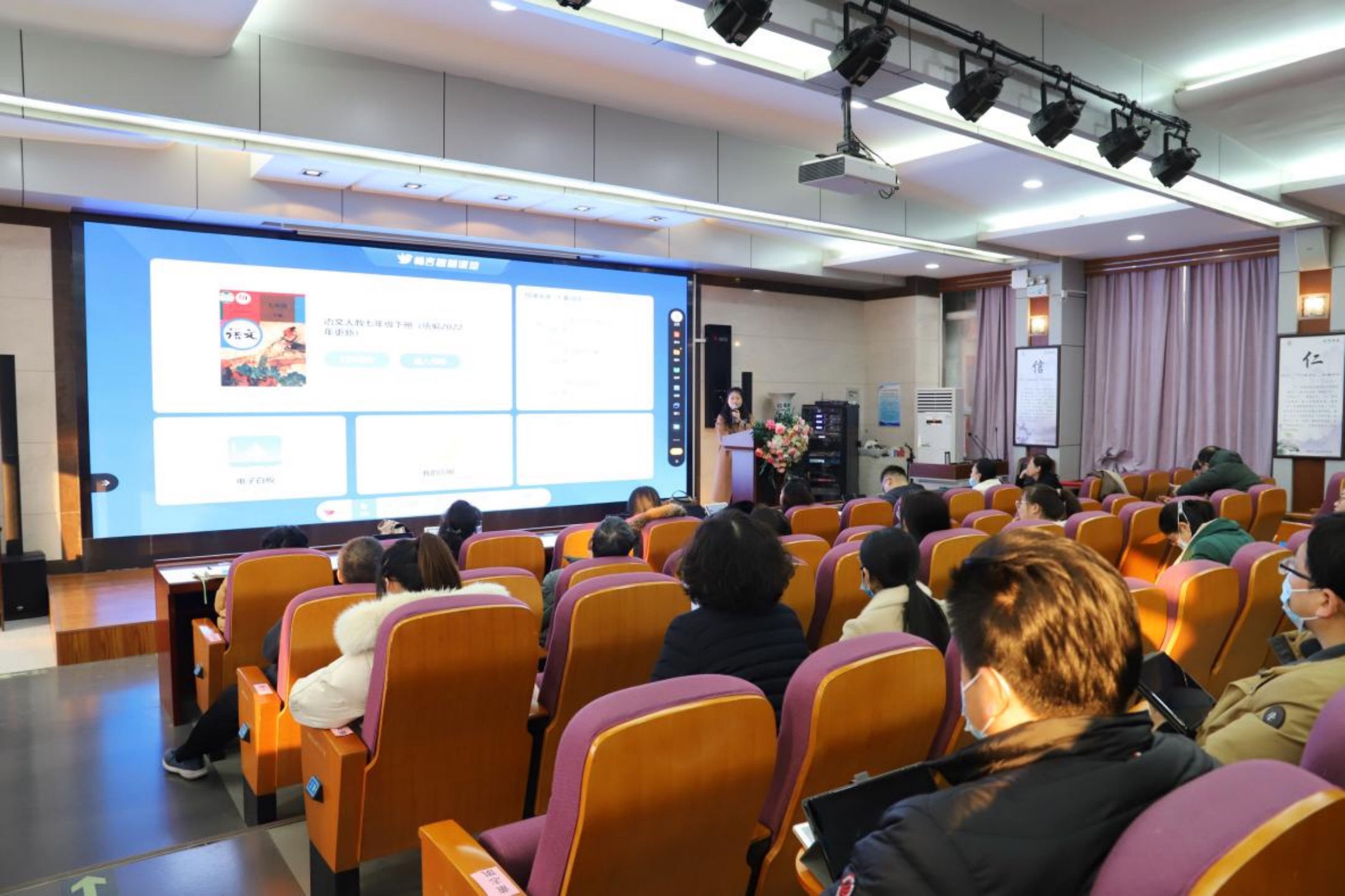 进入启动仪式的第二个部分,由科大讯飞许婷培训智慧教育的相关应用。许婷通过备课场景、授课场景、课后场景等具体教育教学场景,介绍在“教、考、评、校、管” 等环节中具体的信息技术操作和应用。以老师们的现实问题出发,通过信息技术促进老师的教学效率提升。