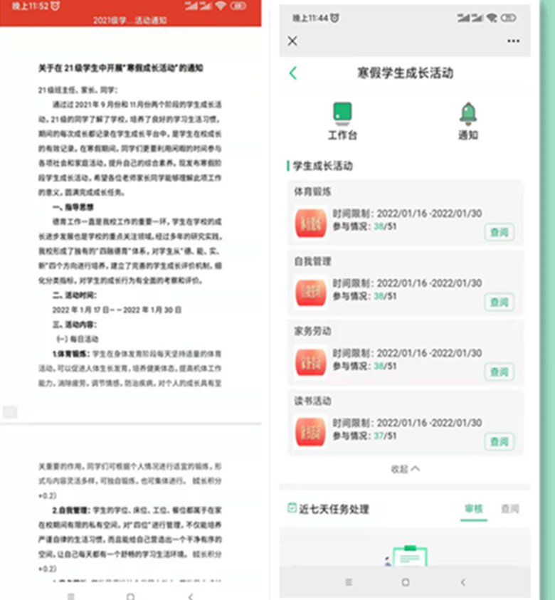 据了解,2022年寒假期间,正逢抗击新一轮疫情的严峻形势,为了让同学们在这个特殊日子里过得充实,该校学生处利用校园智慧网平台,创造性地开展了“寒假学生成长活动”。学生成长任务分为:我与家人聊一聊、开开心心过大年、我为抗疫做贡献、体育锻炼、自我管理等五项内容。分别从不同的维度激发学生的孝心、爱心和责任心,培养学生的道德素养和良好行为,学生每完成一项任务,会向平台实时传送一张活动照片,成长积分会自动增加0.2分,同时计入学校后台的大数据中心,便于学校德育部门和班主任随时追踪和关注学生的成长动态,及时用数据向学生家长反馈孩子的成长轨迹。
