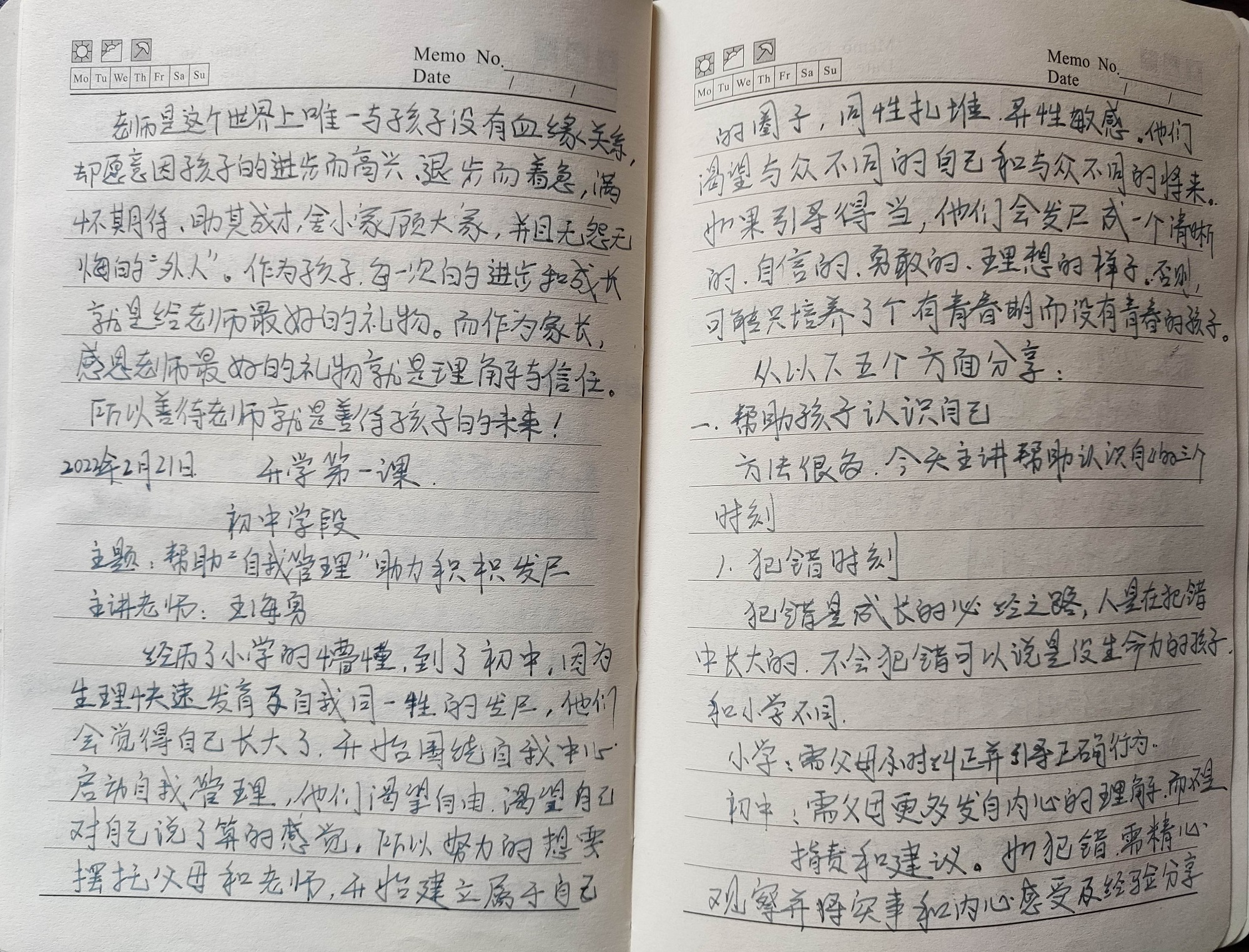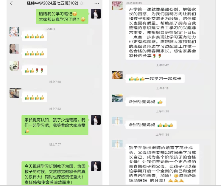 听君一席话,胜读十年书。家长们纷纷在微信群中晒出学习笔记和学习感悟。2024届张劭弸妈妈说道:“开学第一课就像是强心剂,解答家长的困惑,为我们指明方向,让我们和孩子相处交流更为顺畅,陪伴成长更有质量。听完讲座,我感觉到帮助孩子拥有掌握管理的意识、建立自主学习的行为非常重要,先根据孩子自身情况定下目标一点点、一步步实现,让学习更有动力,也更有成就感。”