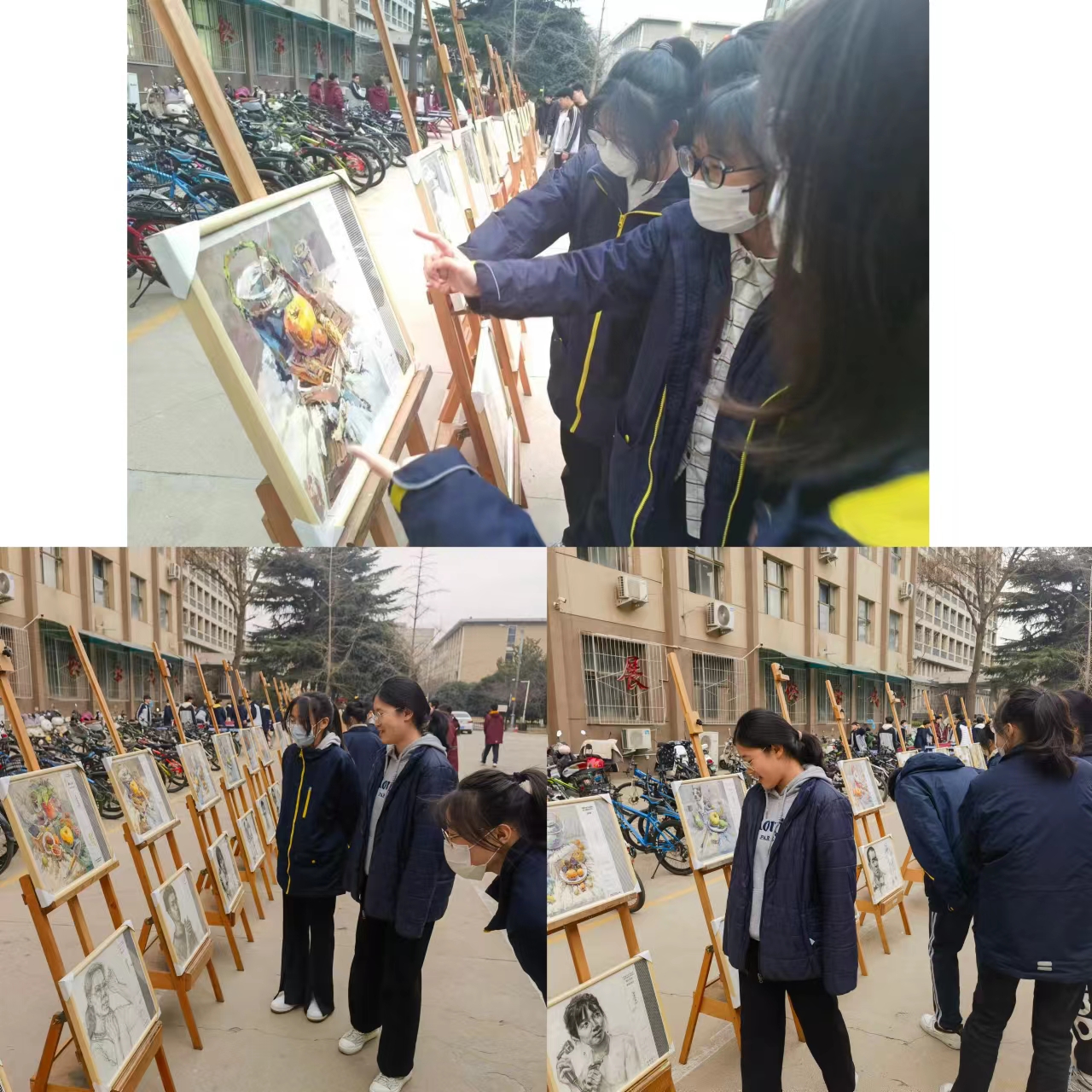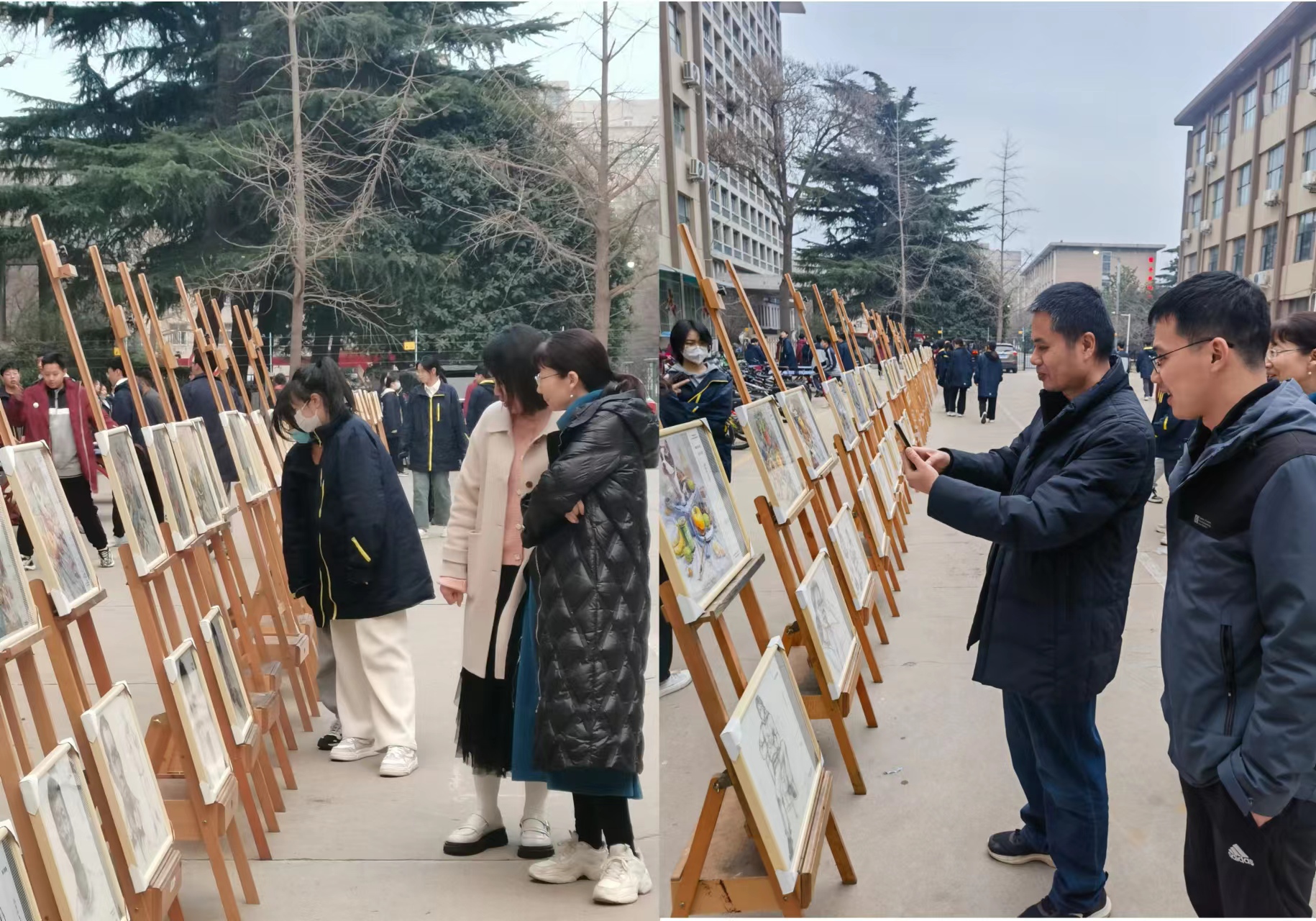 此次美术特长生作品展在室外开展,随着下课铃声的准时响起,在广播播报提示语中,学生们兴致勃勃来到展品前,或浅声低语,或高声谈论,或凝神细看,一个个的竞相点评自己眼中最优秀的作品。这次美术作品展既吸引了学生的目光,也引来一些老师驻足观看。老师们在欣赏的过程中,遇到心仪的作品,通过相机记载下艺术美的瞬间。