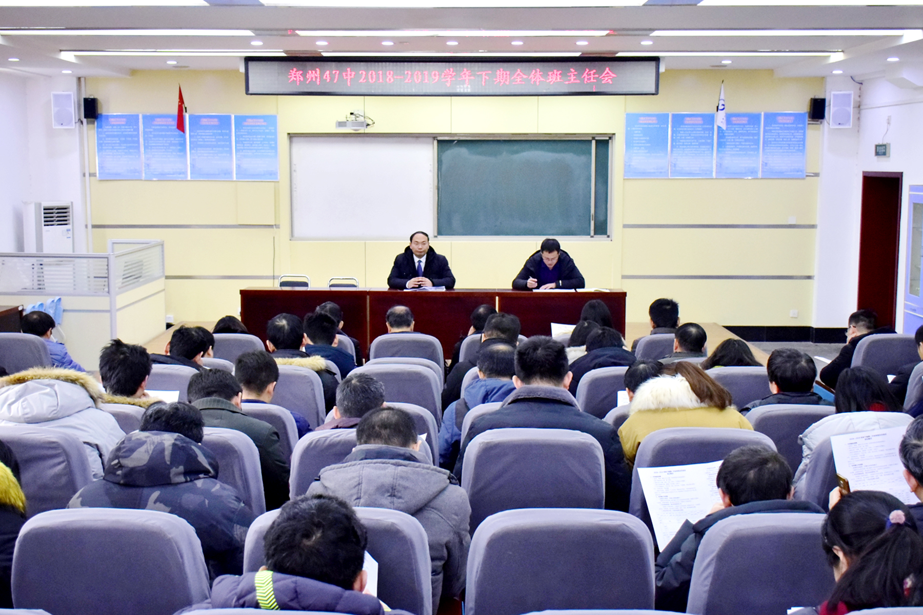新学期,新征程。为增强班主任工作能力,提高班主任整体素质,进一步加强班级管理工作的针对性和实效性,提升学校德育工作和班级管理水平,全面落实“立德树人”的根本任务,2月19日下午,郑州47中高中部召开2019年春季开学班主任工作会议,副校长栗红涛、德育处副主任李大民及高中部全体班主任参加会议。