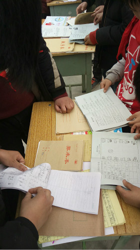 孩子们排队有序地翻看优秀寒假作业