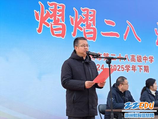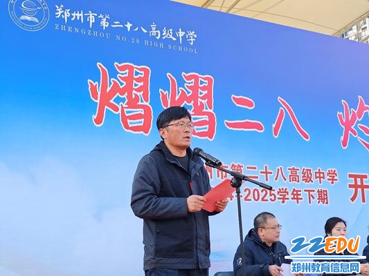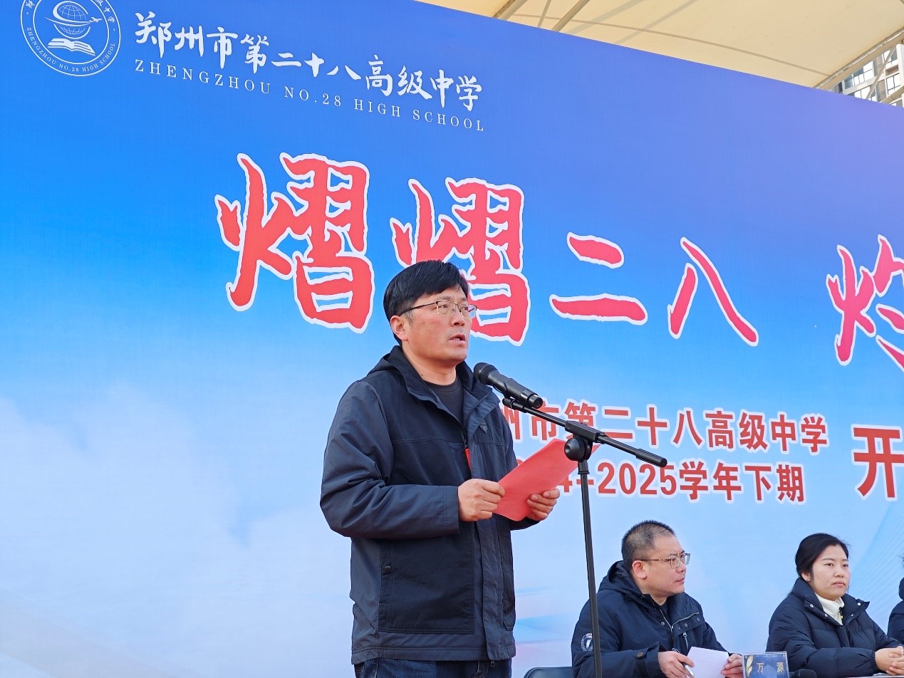 郑州市第二十八高级中学副校长夏向阳在典礼上致辞。他提到,过去一年,DeepSeek人工智能、宇树机器人、英歌舞、鱼灯文化以及《哪吒2》等在各自领域取得耀眼成就,展现了时代风貌。他希望同学们在科技与文化的交汇中,既掌握知识,又传承中国传统文化;在学习和锻炼中提升自我,把每一天都变成迈向卓越的阶梯。学校将建设劳动实践基地,支持社团活动,并举办清明远足、摄影展、球类运动会等特色活动,助力学生成长。最后,他祝愿全体师生在新学期里思维缜密、情怀温暖、脚步坚定,共同书写学校的新篇章。