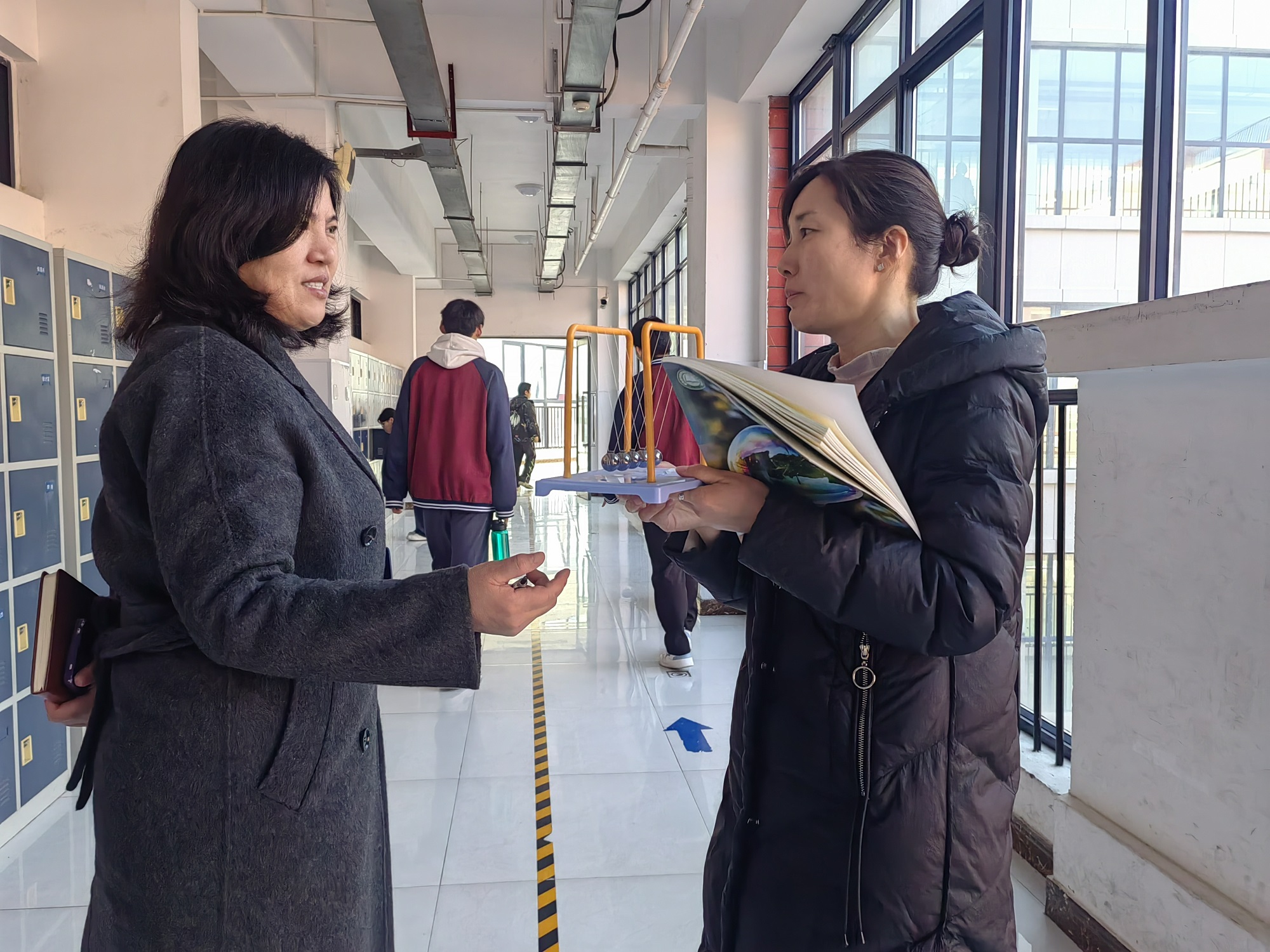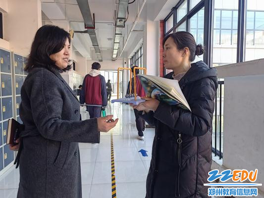 党委书记段亚萍和物理教师董玉雯交流教学心得