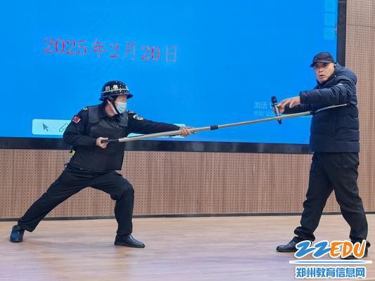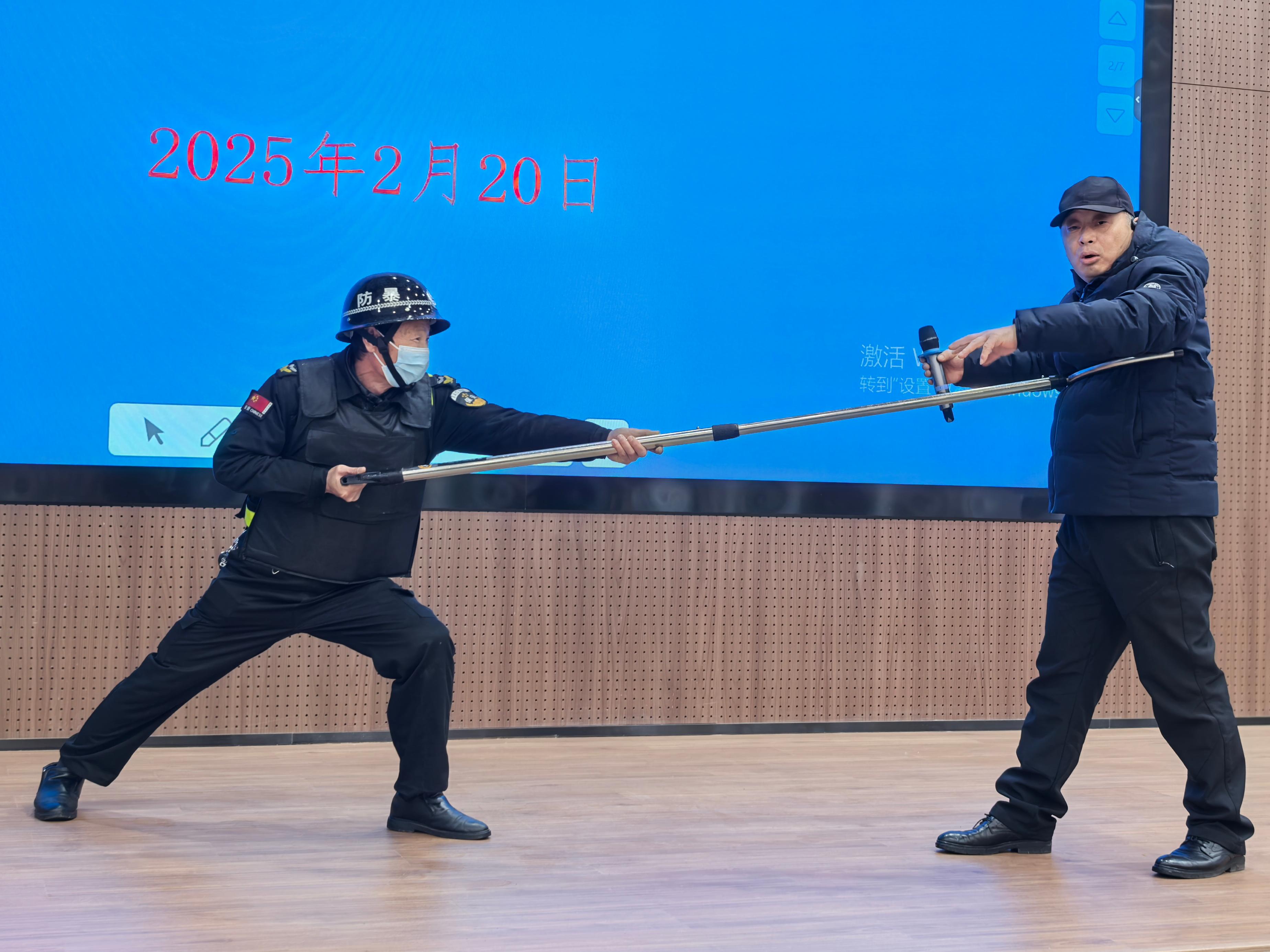 会议聚焦校园安保队伍建设。学校安保团队现场演示了防暴盾牌、钢叉、抓捕器等反恐器材的使用方法。通过模拟操作,全体教师直观了解了应急处置流程,安保人员也展示了快速响应与协同作战的专业能力。此外,学校还将定期组织相应演练活动,坚持每周“一会一学”,确保安保队伍有信心、有能力成为校园安全的守护者。
