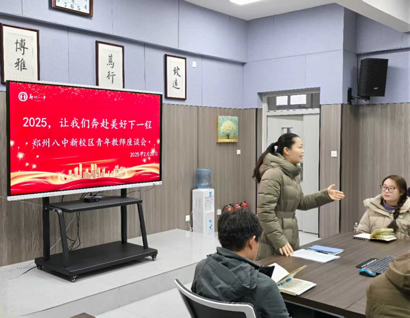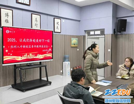 “光阴周而复始,故事永不落幕!2024,所有的温暖、欢笑、眼泪和释怀,书写着秋季学期的章节,也蕴含着2025春季学期的伏笔。新的学期,你想写下怎样的新故事?”2月20日下午,伴随着开场语,郑州八中新校区新学期青年教师座谈会在四楼会议室进行。