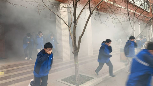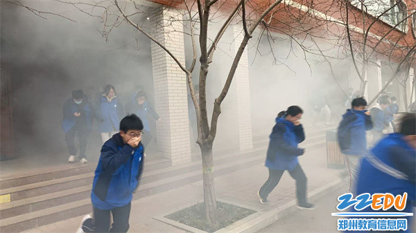 郑州市第一〇一中学组织开展火灾逃生演练,学生们逃离火灾浓烟区。