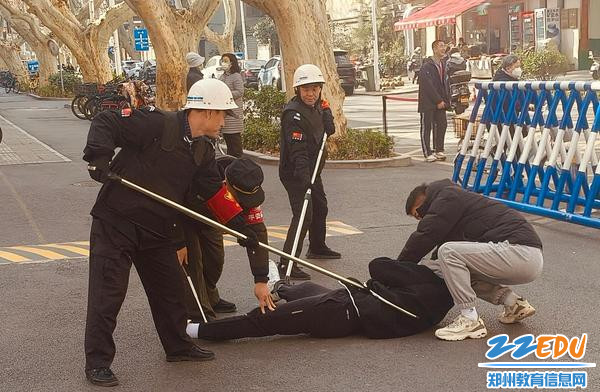 演练中,学生们模拟放学后离校,郑州八中体育教师王贺模拟一名“歹徒”,手持菜刀突然冲到学校门口,并挟持一名学生,学校门口值班教师立刻组织同学们向校门内应急疏散,办公室副主任赵海伟按照应急流程按下“一键报警系统”,并向学校反恐防暴工作组报告当前情况。学校反恐防暴工作组教师、门卫和社区巡防员迅速反应,与“歹徒”谈判,拿起钢叉、盾牌等防护器械进行缠斗,从“歹徒”背后将菜刀夺走解救人质后,合力将其制服并带离现场。至此,防暴解除,医疗救护组对受伤学生进行了模拟紧急处置。