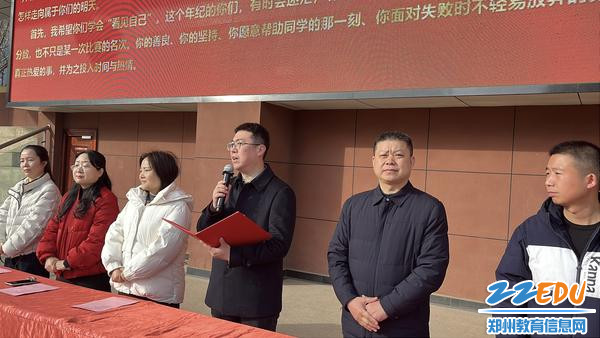 典礼尾声,郑州八中校长李益致辞,以深厚的教育情怀与殷切的成长寄语,为师生们送上期许与祝福。他首先肯定了全体师生一学期来的辛勤付出与丰硕收获。随后,向同学们提出三点假期期望:一是深耕自我之根,要看见自己,不困于他人眼光,锚定内心热爱,在自主学习与兴趣探索中滋养个性成长;二是筑牢思考之根,要清醒思考,在信息洪流中保持独立判断,多问为什么,在阅读与沉淀中提升认知深度,让思想之根更加坚韧;三是厚植情怀之根,要温暖且勇敢,既以温情对待他人、传递善意,也以勇气直面挑战、突破自我,在责任与担当中彰显青春底色。校长的话语既饱含对学子的关爱,更紧扣“根文化”教育思想,引导同学们在假期中持续扎根、蓄力成长。