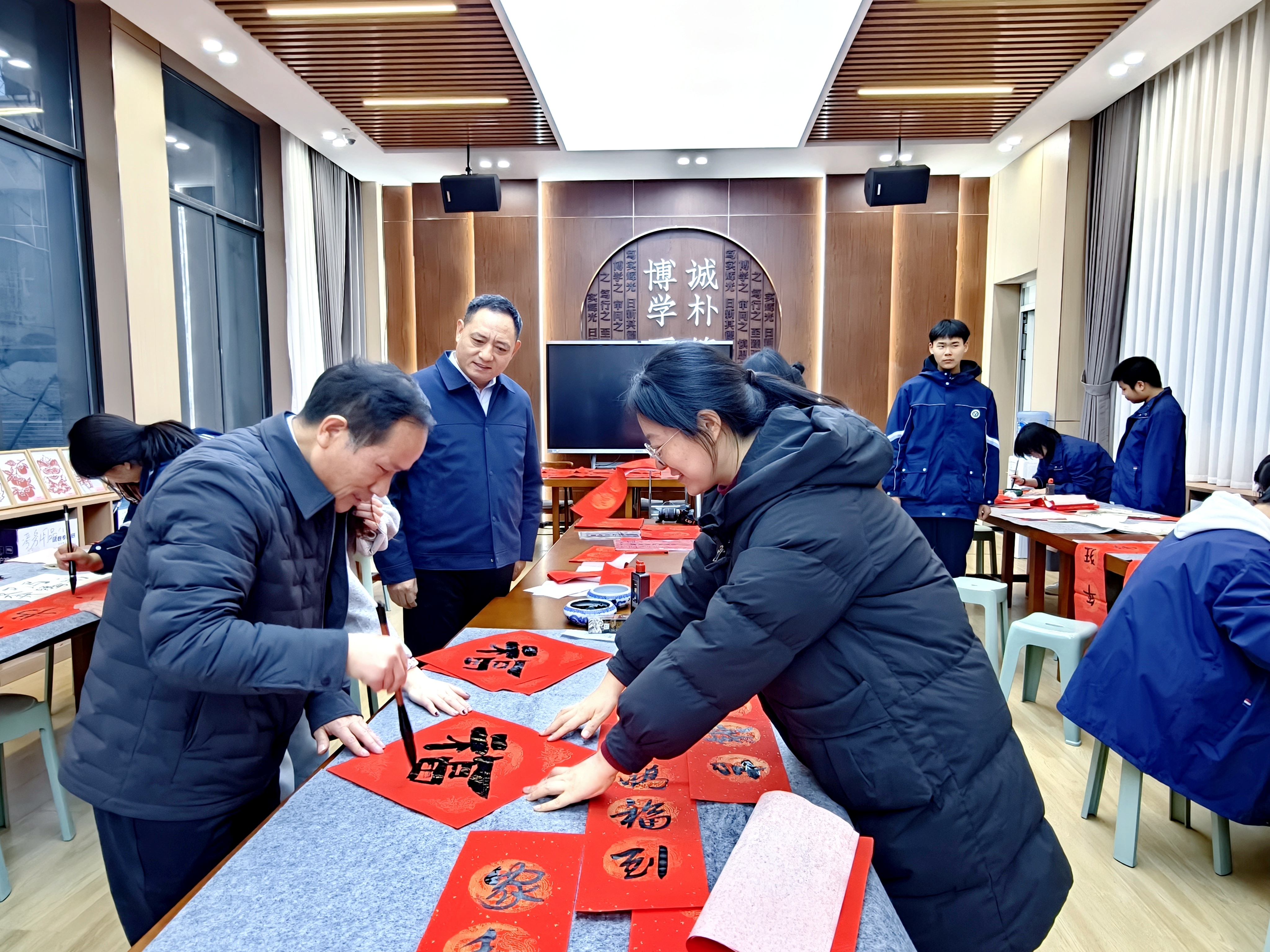 笔走龙蛇书壮志,纸承墨韵贺新春。学子们各显神通,楷书端庄秀丽、隶书古朴厚重、行书飘逸洒脱,不同字体各有风骨。“光阴不为少年留,术业宜从勤学起”“百世岁月当代好,千古江山今朝新”,楹联中是少年们对未来的憧憬。一幅幅春联对仗工整,一个个“福”字圆润饱满、暖意融融,展现了少年昂扬向上、奋勇争先的青春姿态,诠释了“灵智并进”的校训内涵。