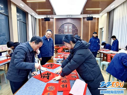 郑州市第五高级中学校长王勇观看杨兆捷老师写“福”