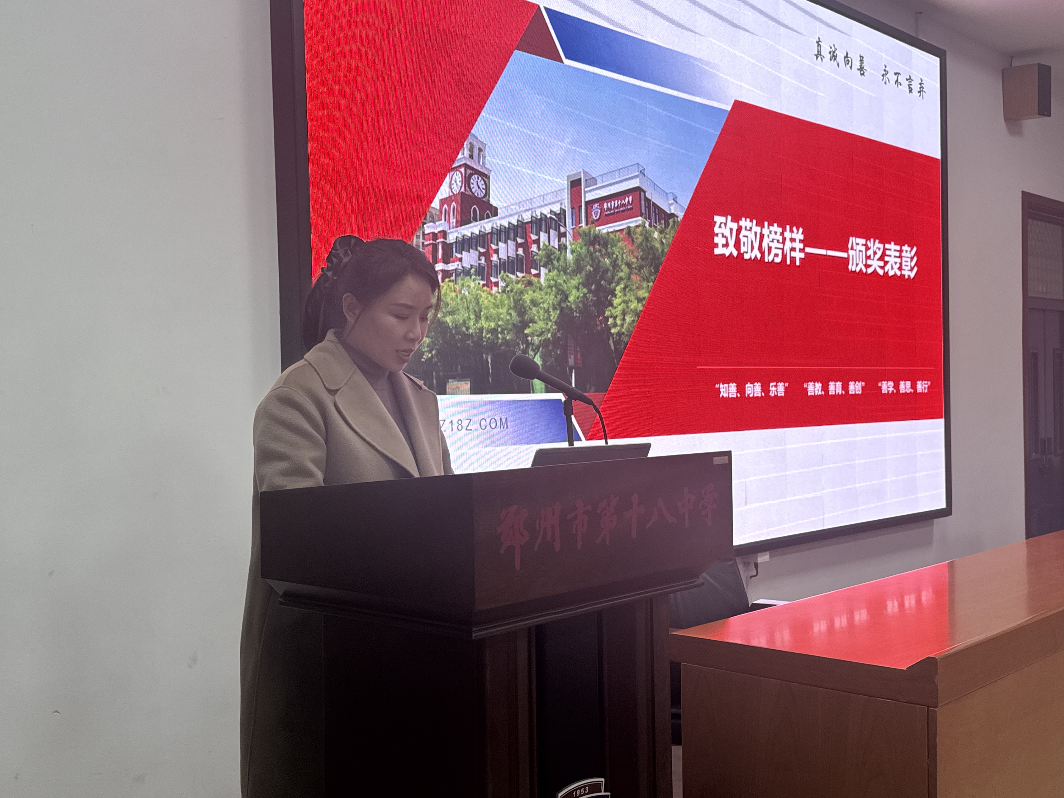 郑州市第十八中学副校长司彩贞宣读学校表彰文件
