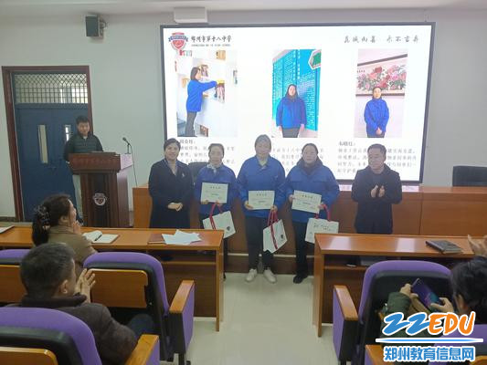 郑州市第十八中学副校长司彩贞宣读了学校表彰决定。经严格评选,郭翠花、顾全、闫琰等10名同志荣获“最美保洁员”“最美餐厅员工”“最美宿舍教官”等称号。学校领导为获奖者颁发了证书与奖品,感谢他们为学校发展作出的贡献。