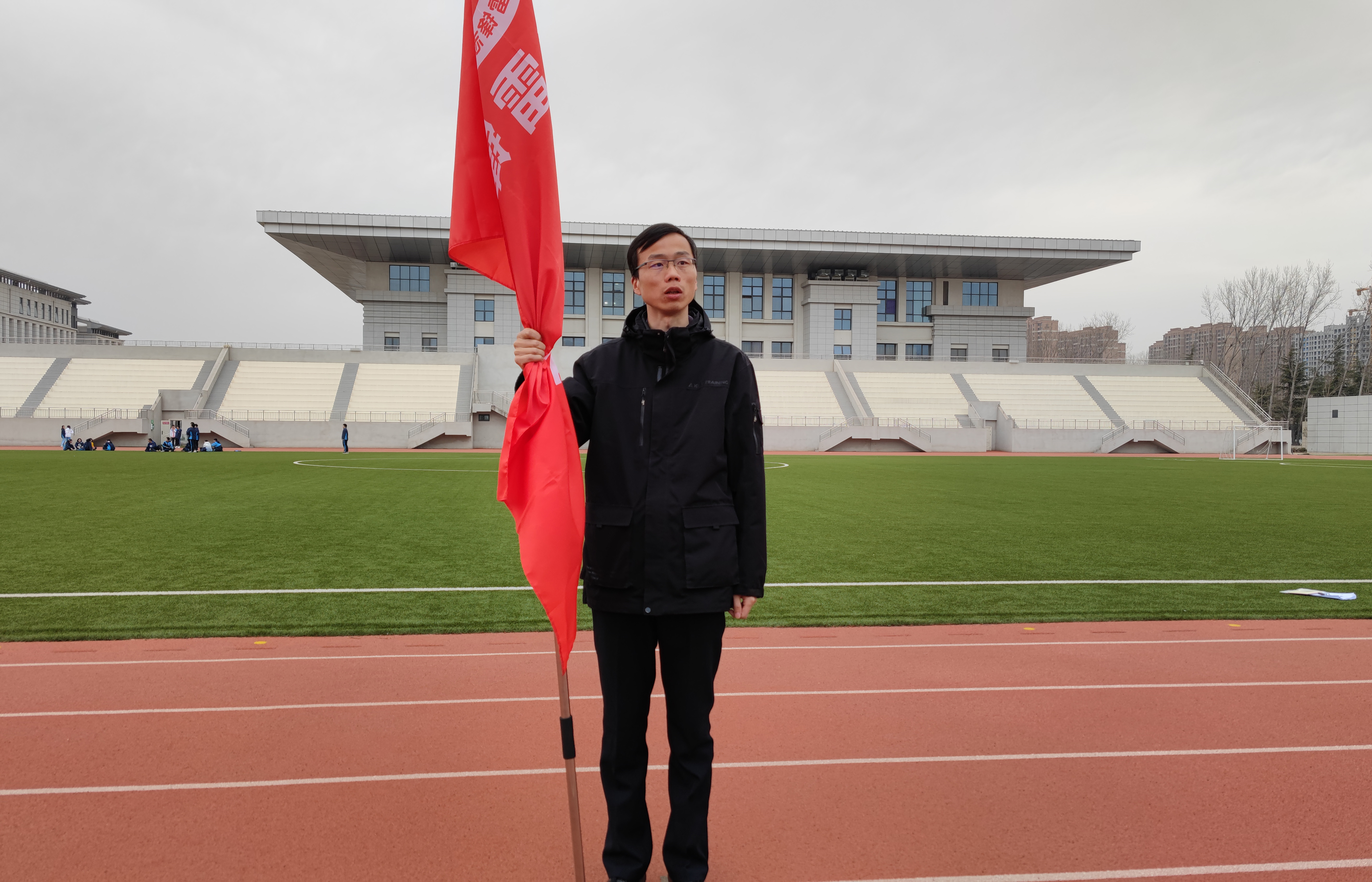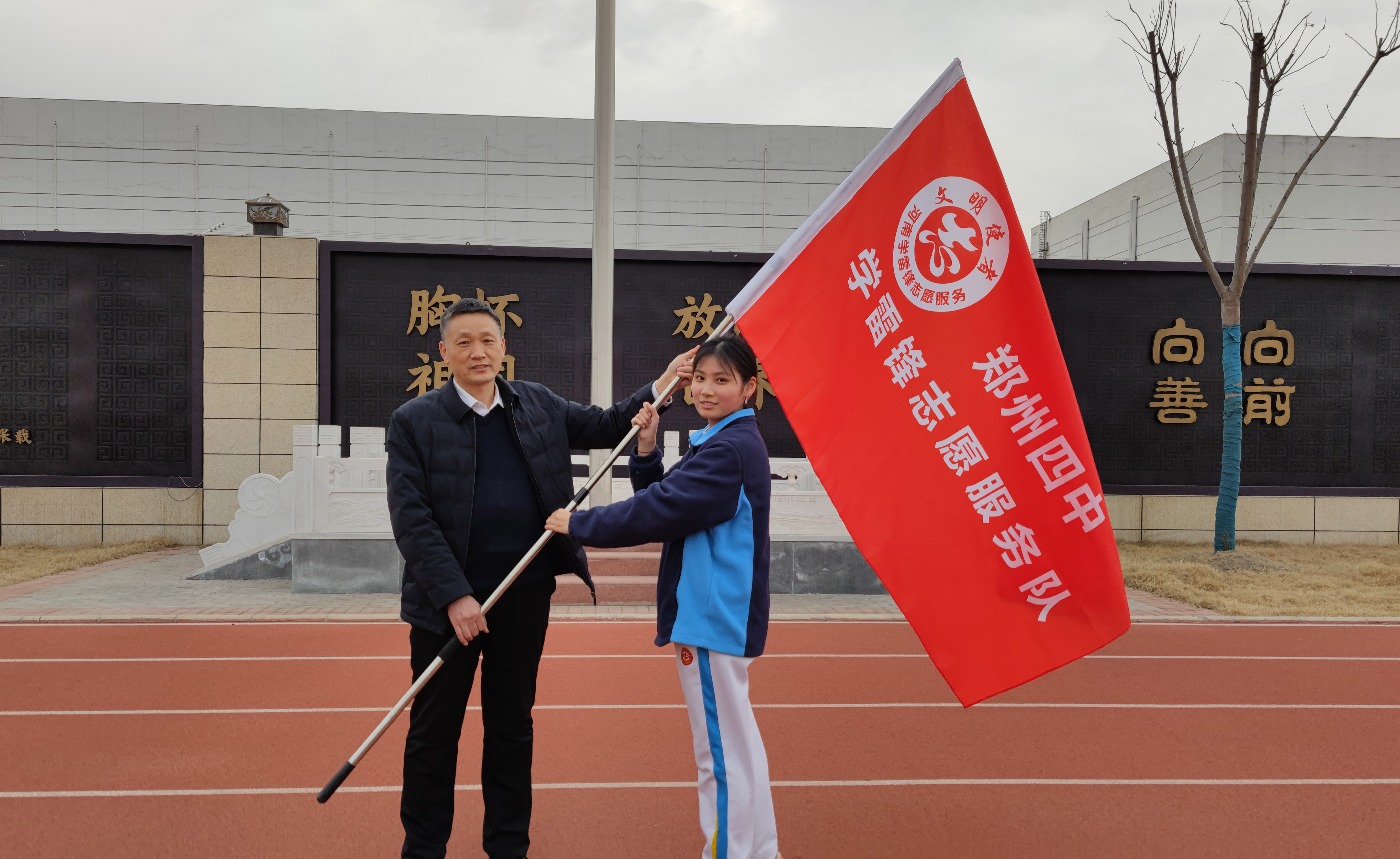 郑州市第四高级中学副校长刘继勋向学生代表授旗